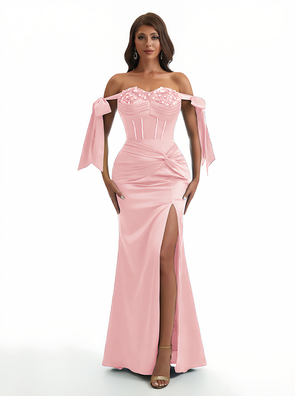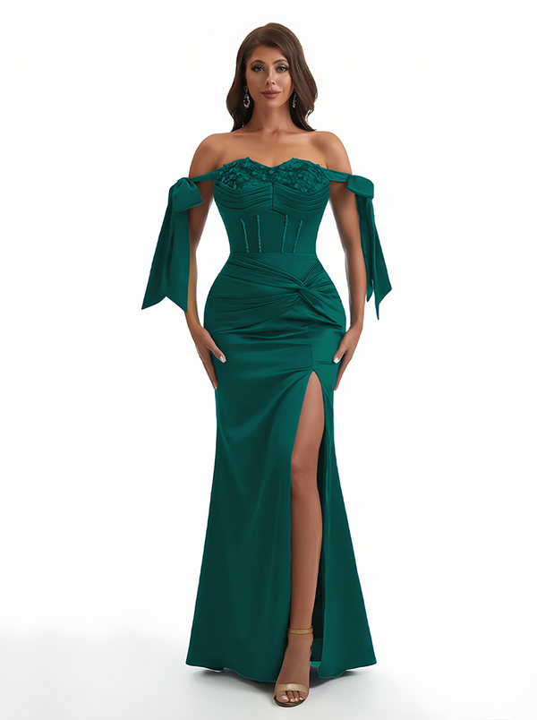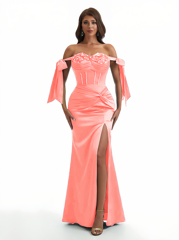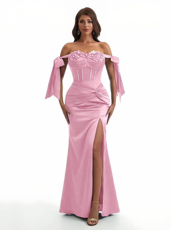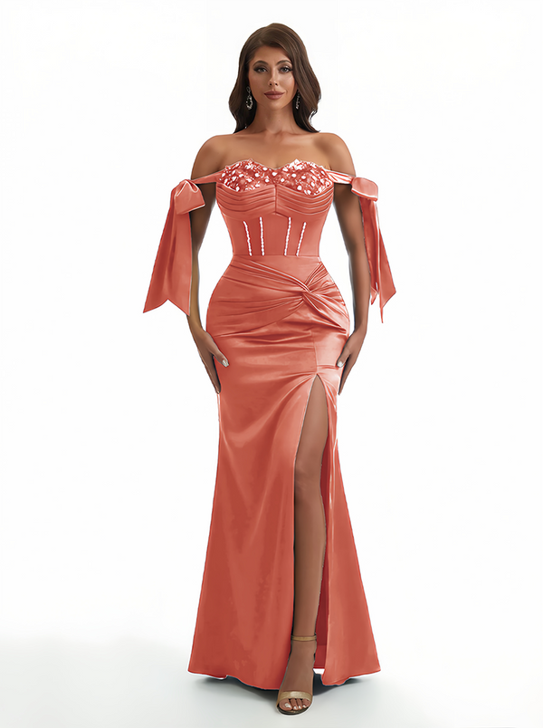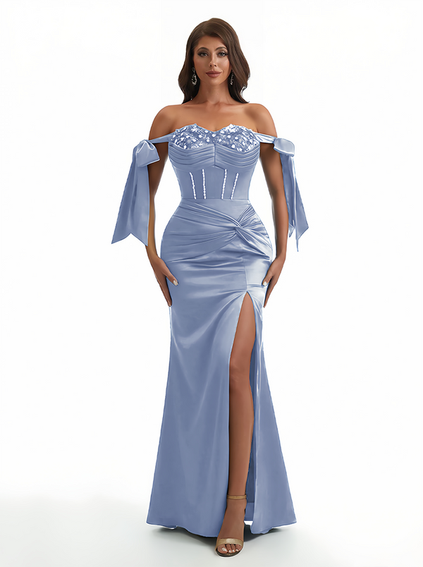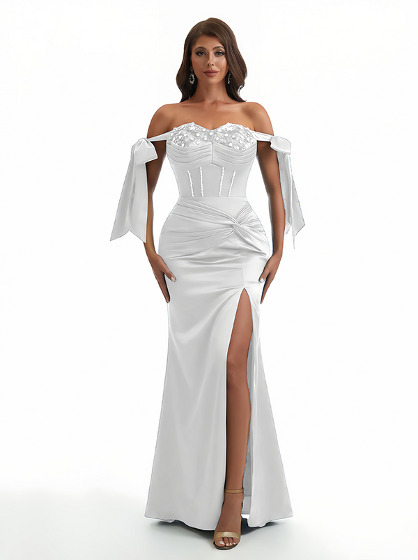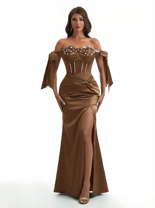 Sexy Off Shoulder Beading Ruched Satin Mermaid Silky Satin Long Formal Dresses Side Slit