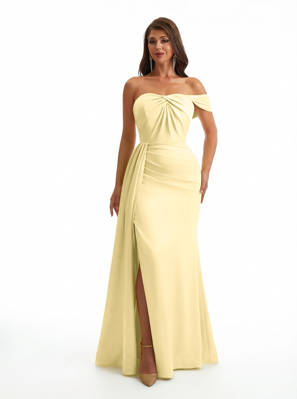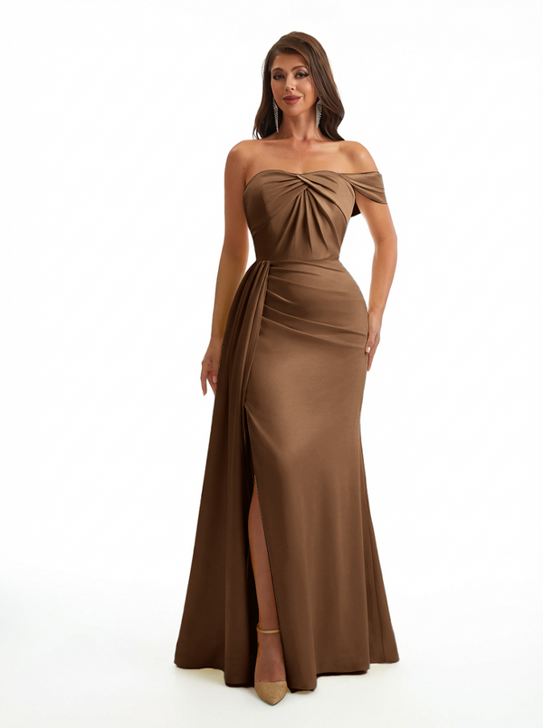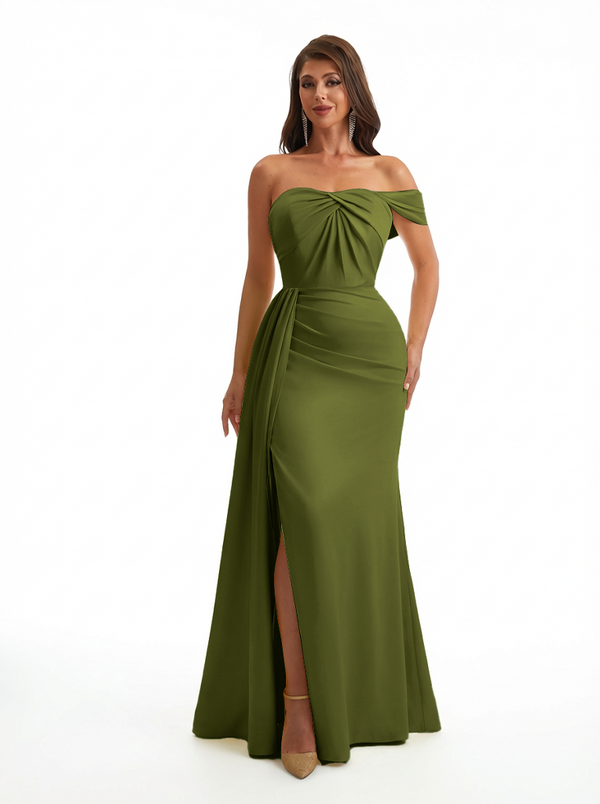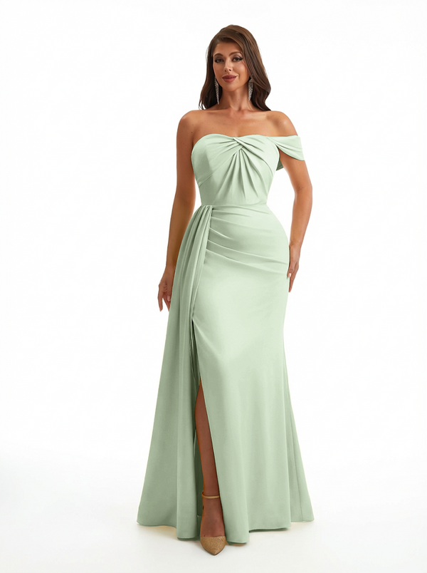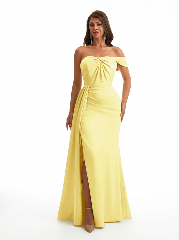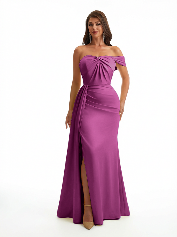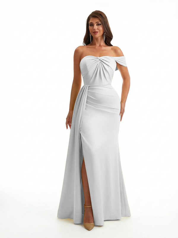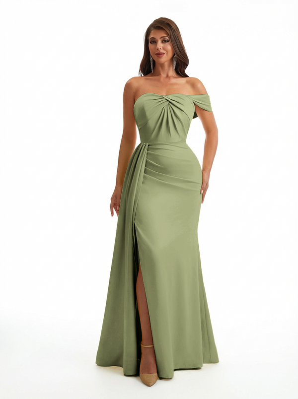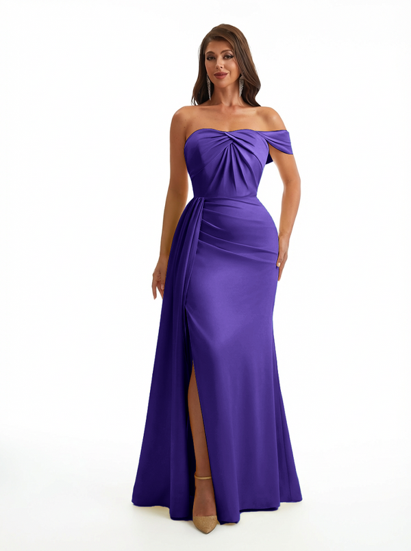 Modern One Shoulder Ruched Mermaid Silky Satin Maxi Formal Dresses Side Slit