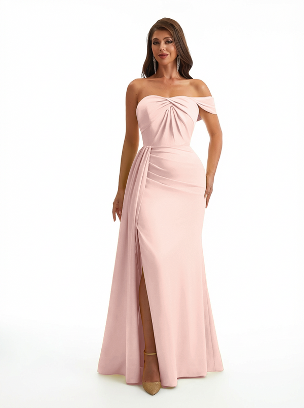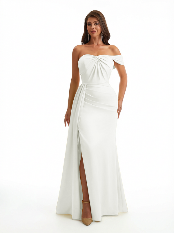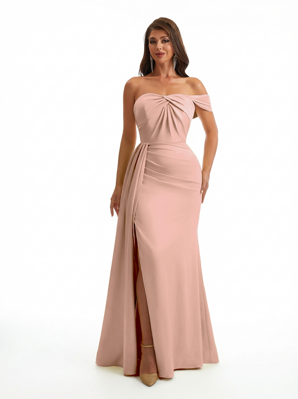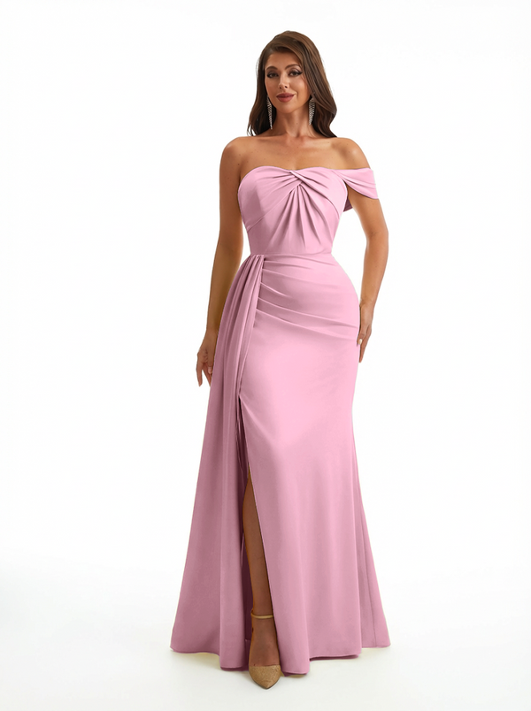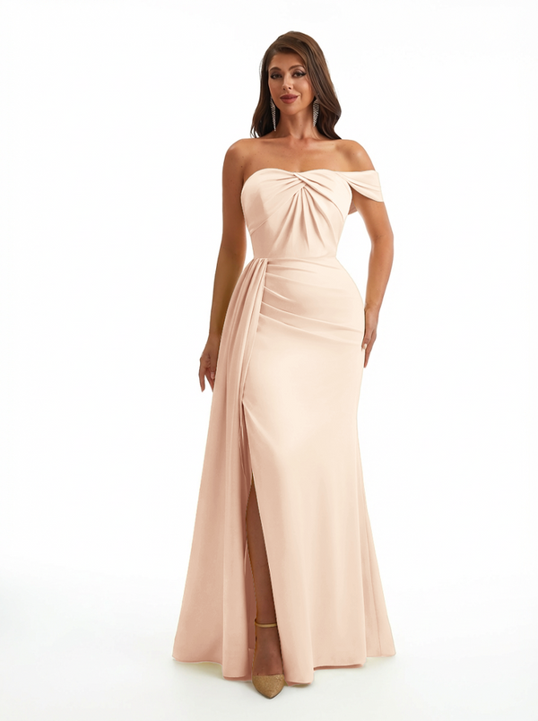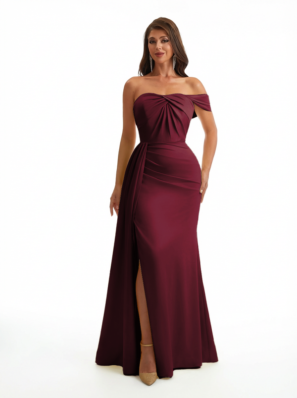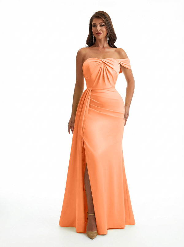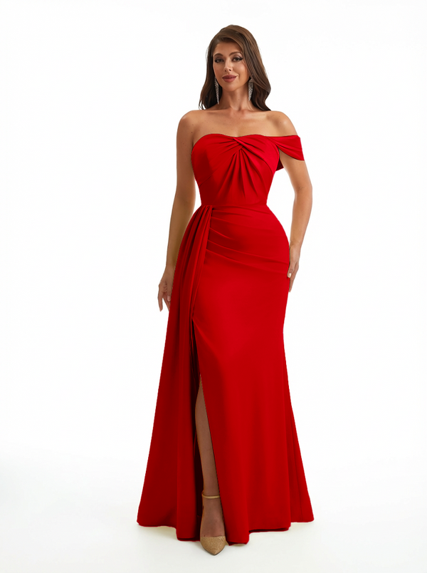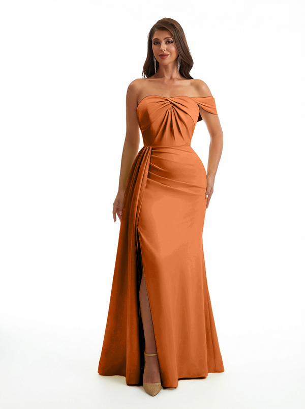 Modern One Shoulder Ruched Mermaid Silky Satin Maxi Formal Dresses Side Slit
