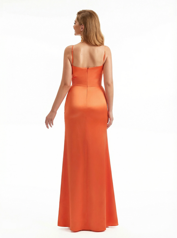 Sexy Cowl Side Slit Mermaid Soft Satin Long Formal Gowns For Women Spaghetti Straps