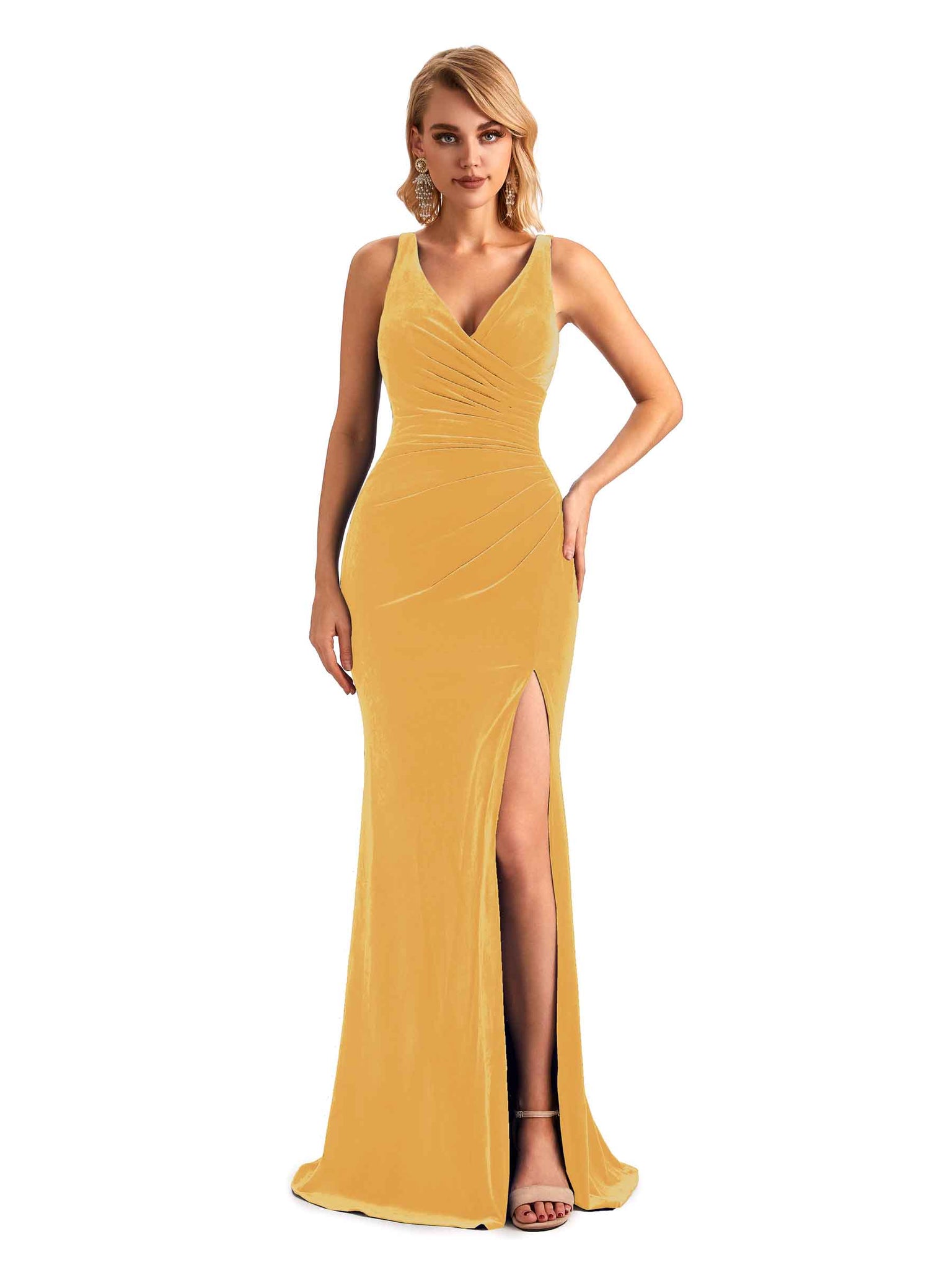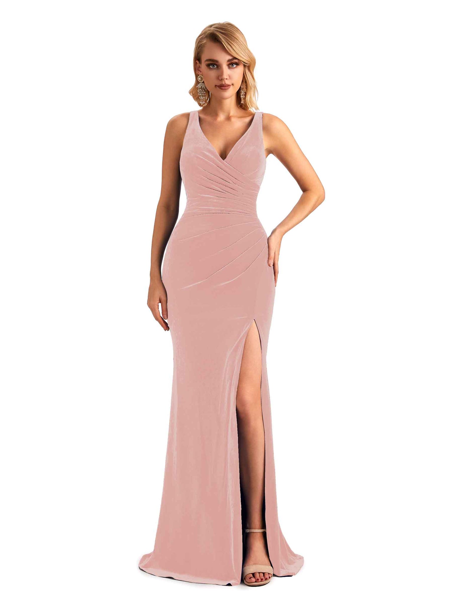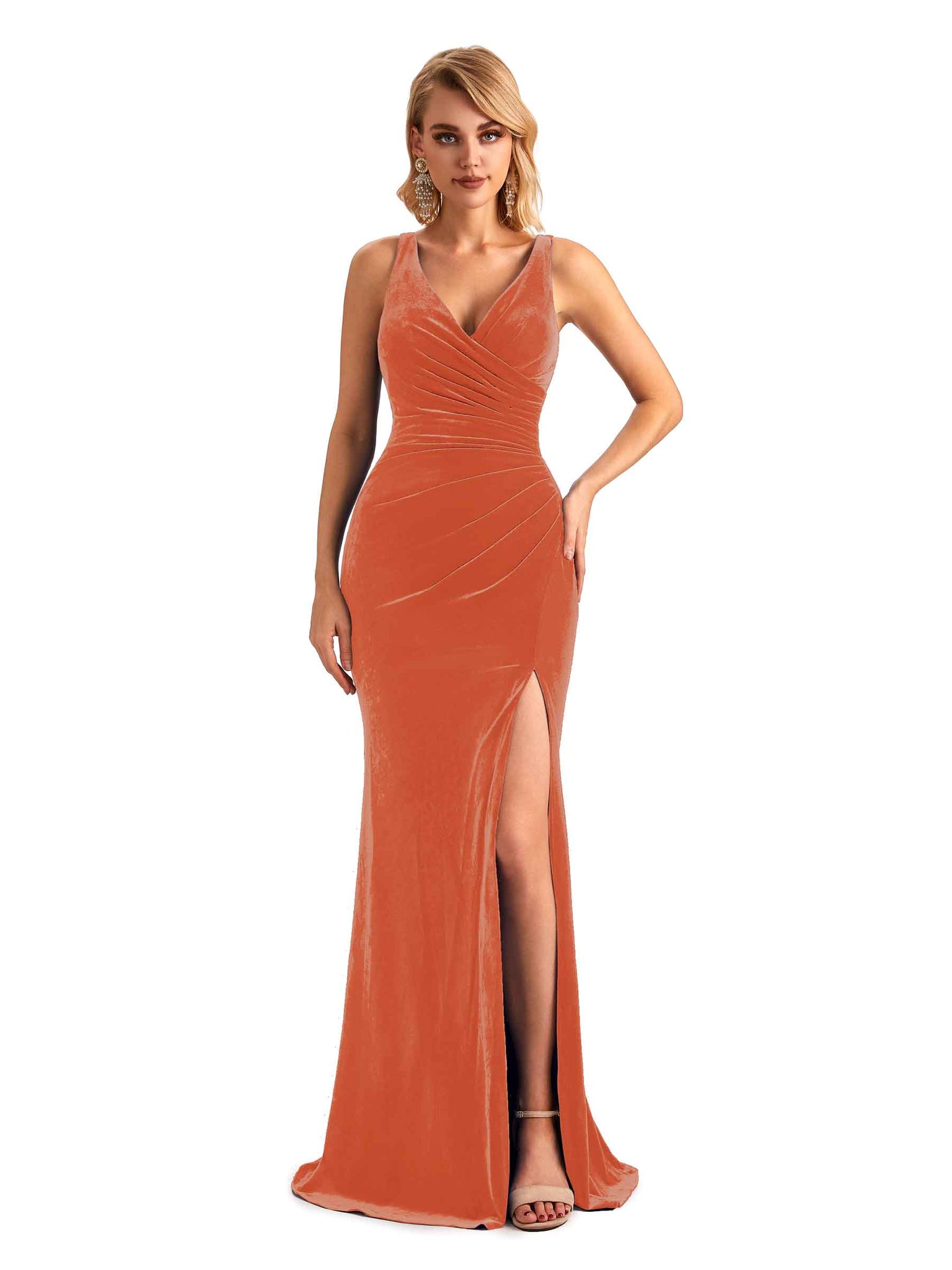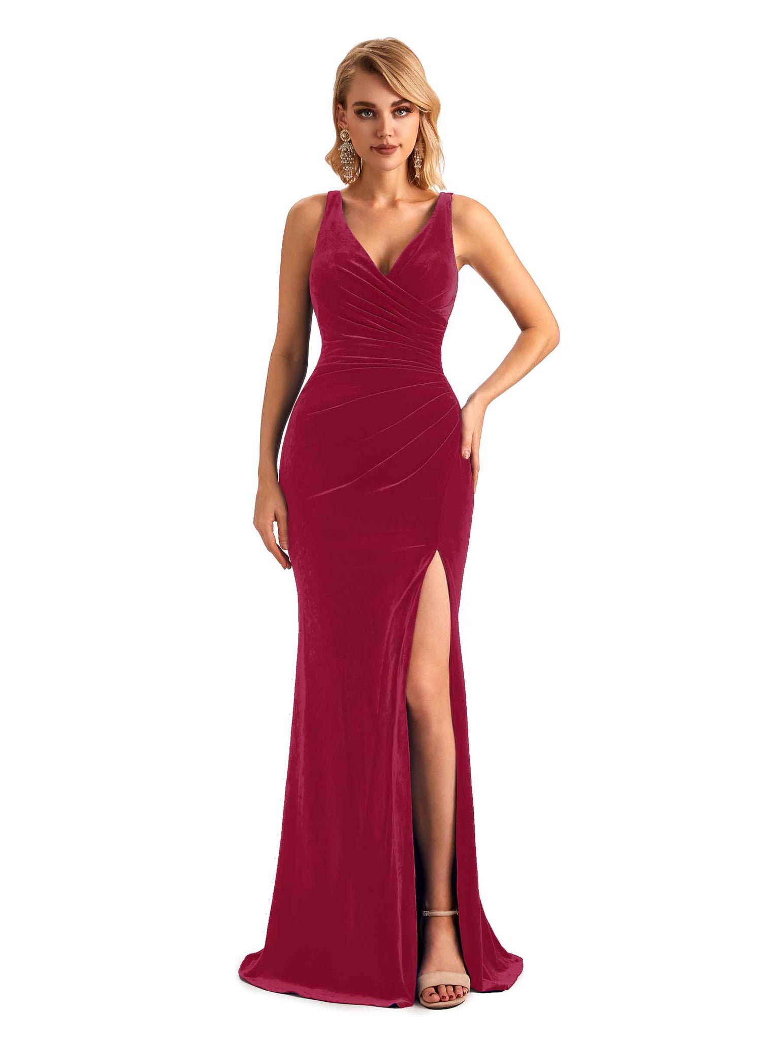 Sexy Side Slit Mermaid V-Neck Velvet Long Bridesmaid Dresses Online