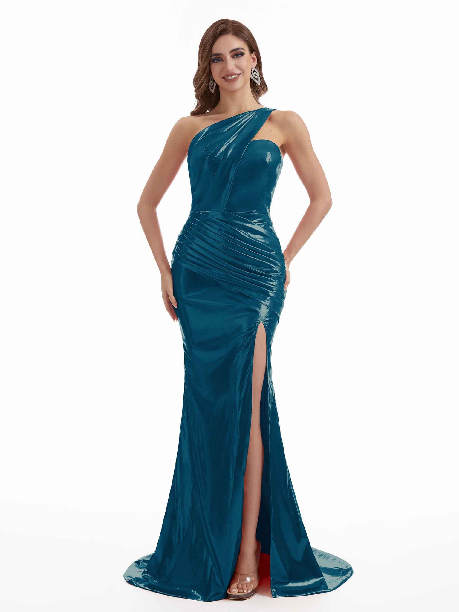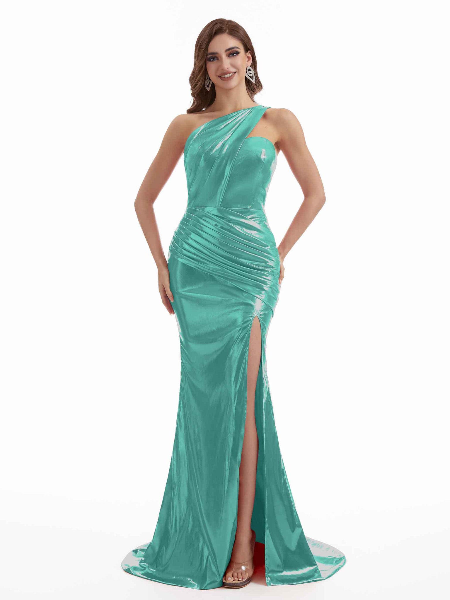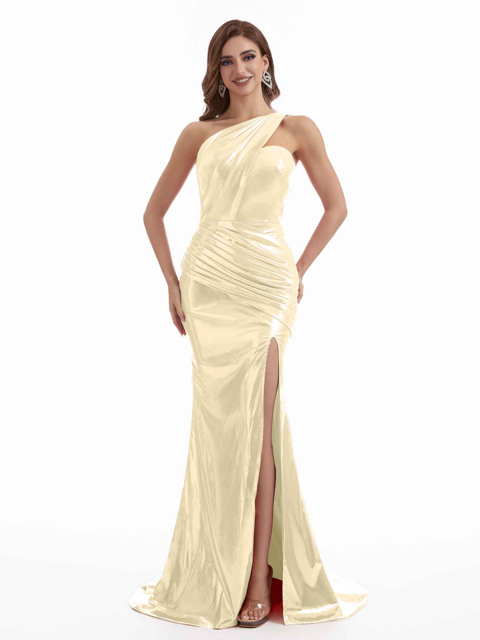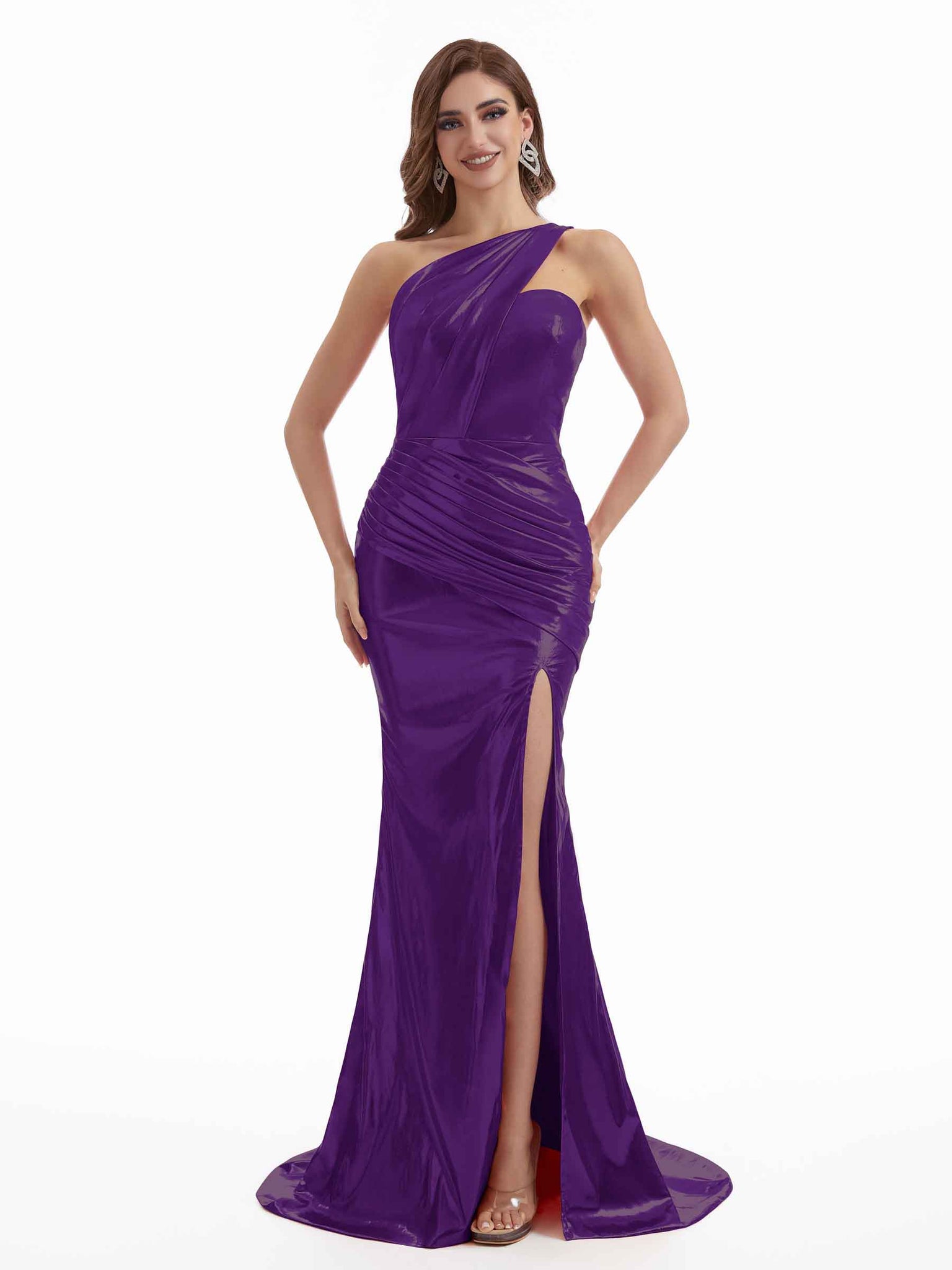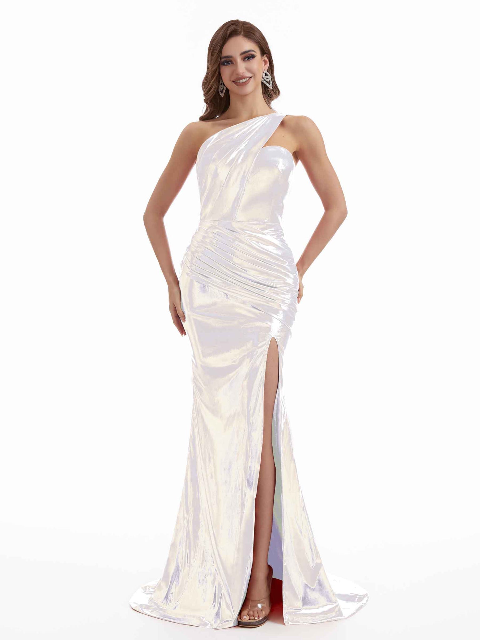 Sexy Side Split Mermaid One Shoulder Ruched Metallic Long Dresses Online