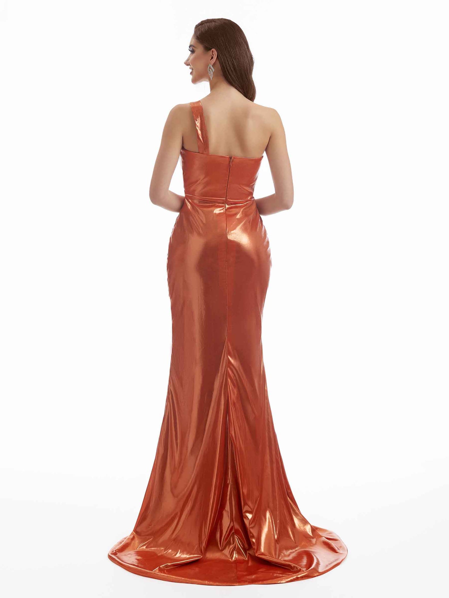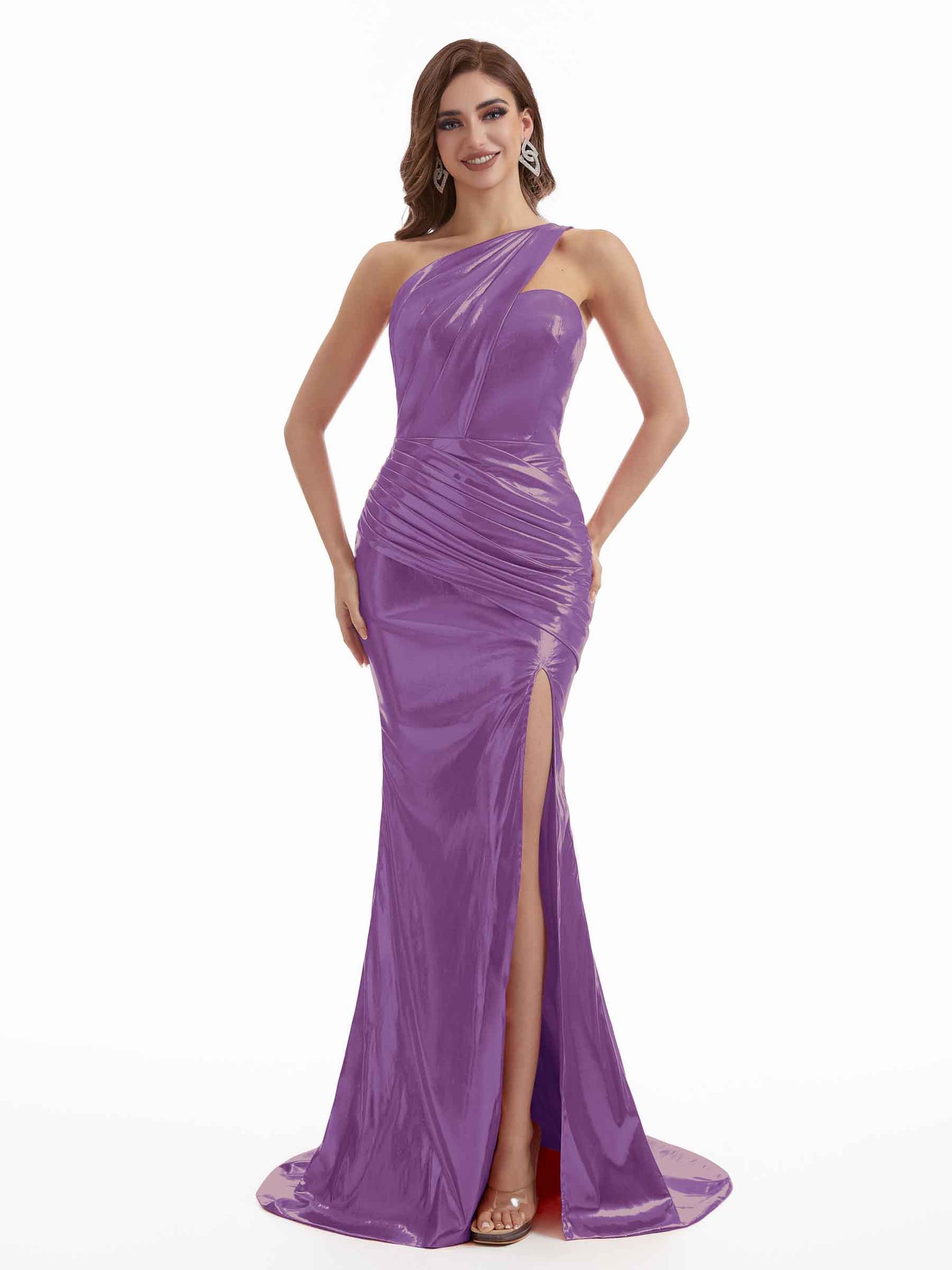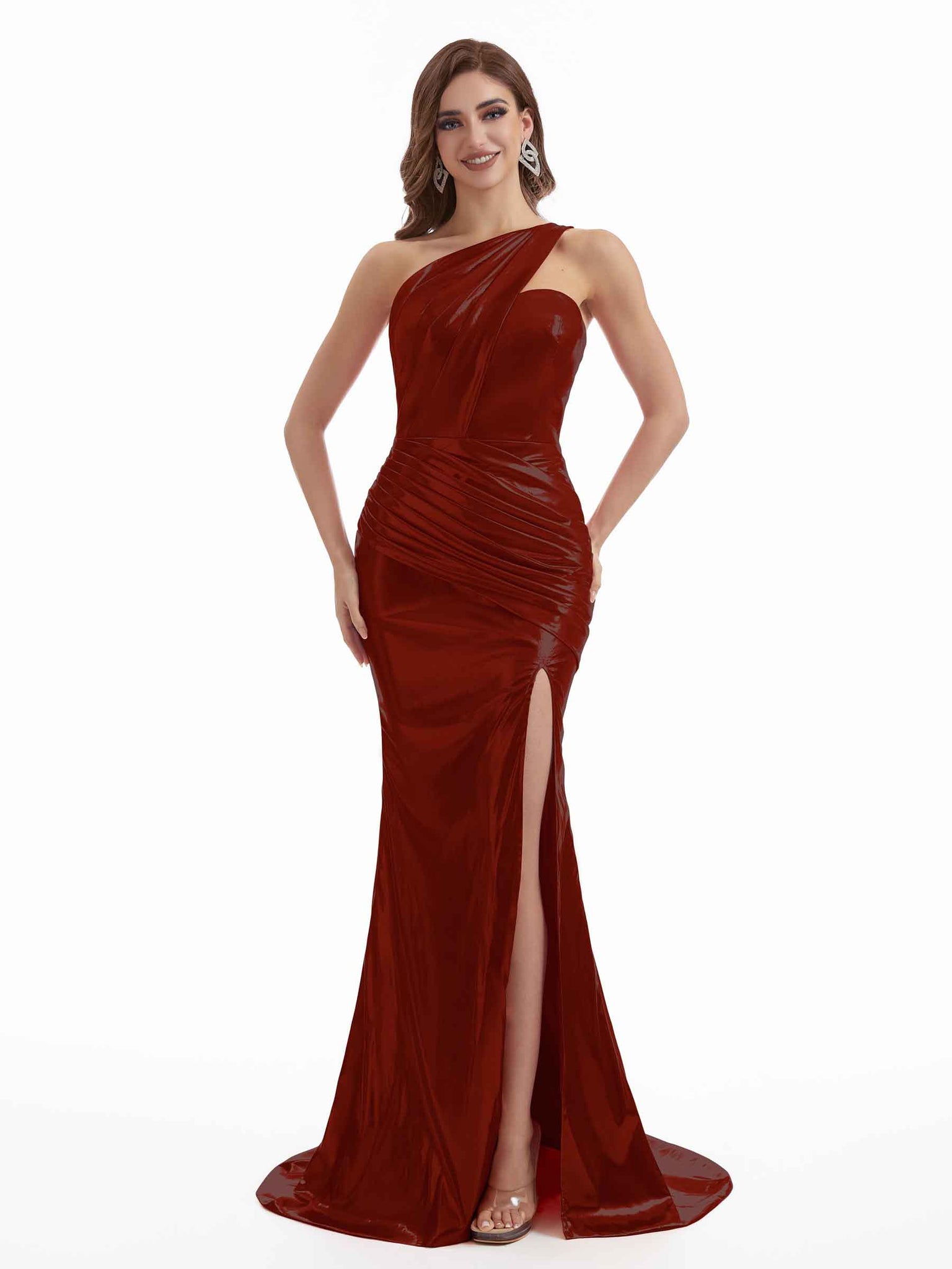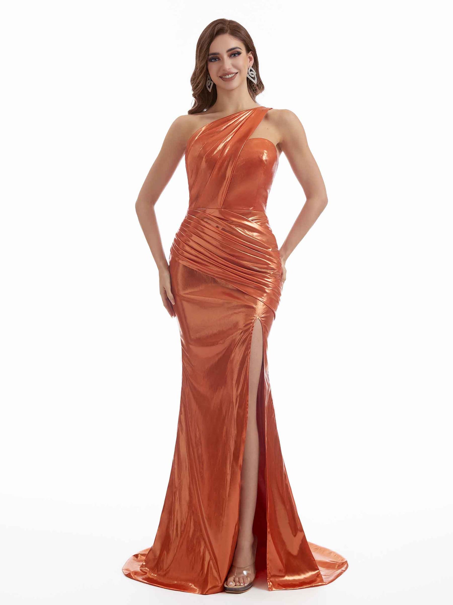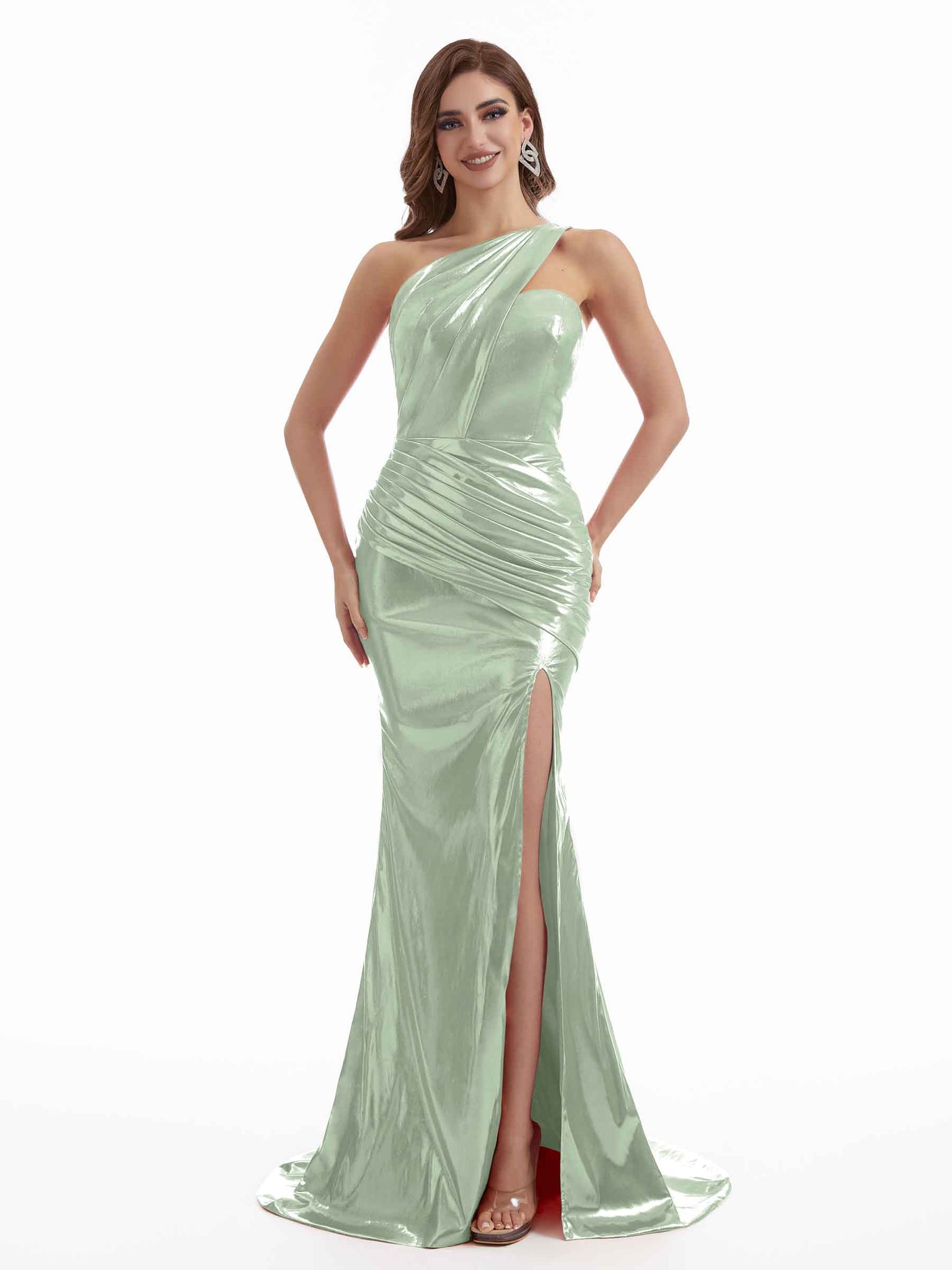 Sexy Side Split Mermaid One Shoulder Ruched Metallic Long Dresses Online