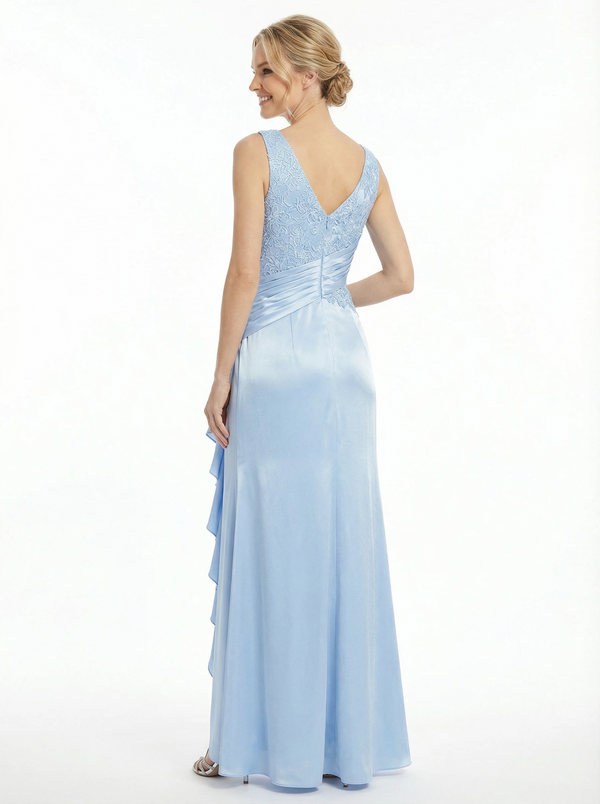Classy V-Neck Lace Evening Dress With Ruched Satin Waist And Cascading Side Ruffles