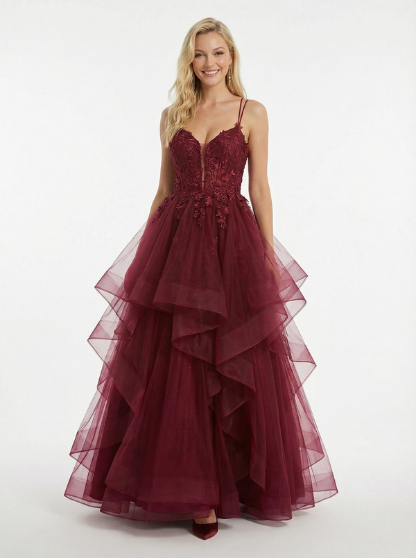 Elegant Lace Beaded Spaghetti Straps Ball Gown Long Prom Dresses