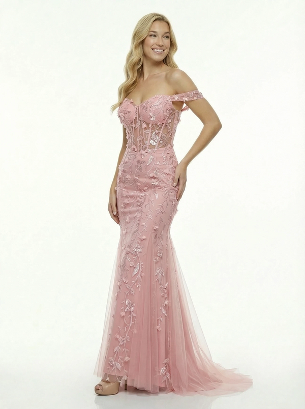 Romantic Off-Shoulder Floral Prom Dress Illusion Lace Mermaid Gown Tulle Evening Wear $199.99