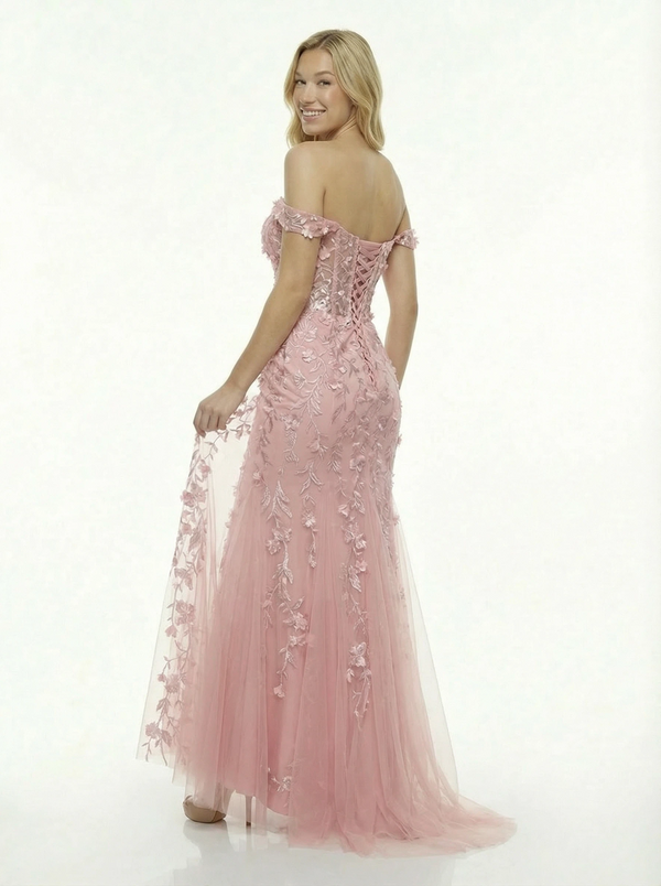 Romantic Off-Shoulder Floral Prom Dress Illusion Lace Mermaid Gown Tulle Evening Wear