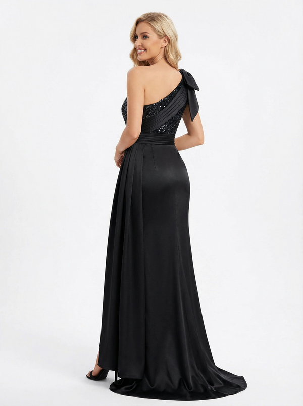 Sparkly One Shoulder Ruched Satin Mermaid Prom Dresses With Bow