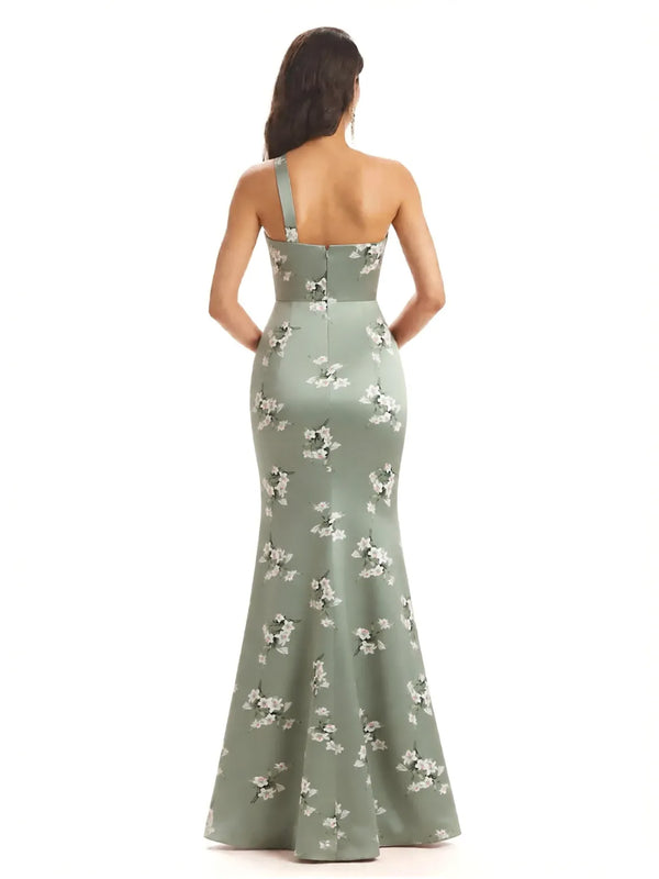 Sexy One Shoulder Side Slit Mermaid Satin Floral Formal Dresses For Women