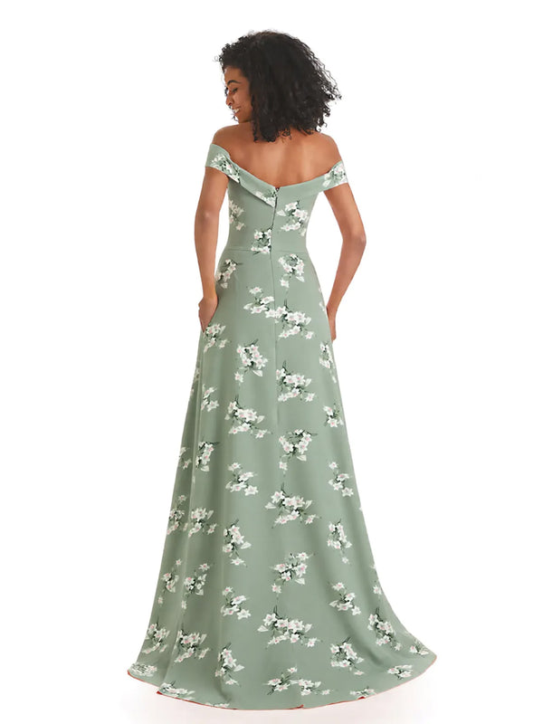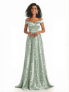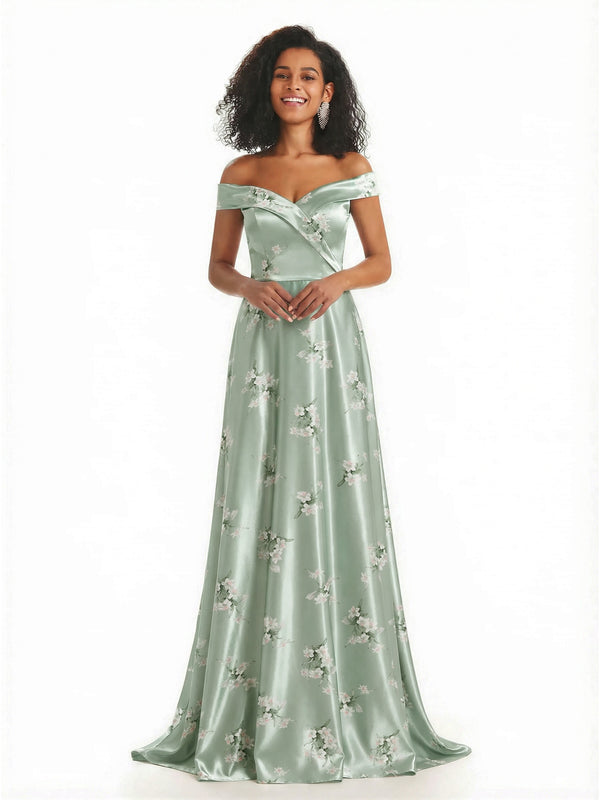 Trendy Off Shoulder A-Line Long Floral Satin Women Formal Evening Dresses