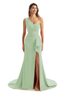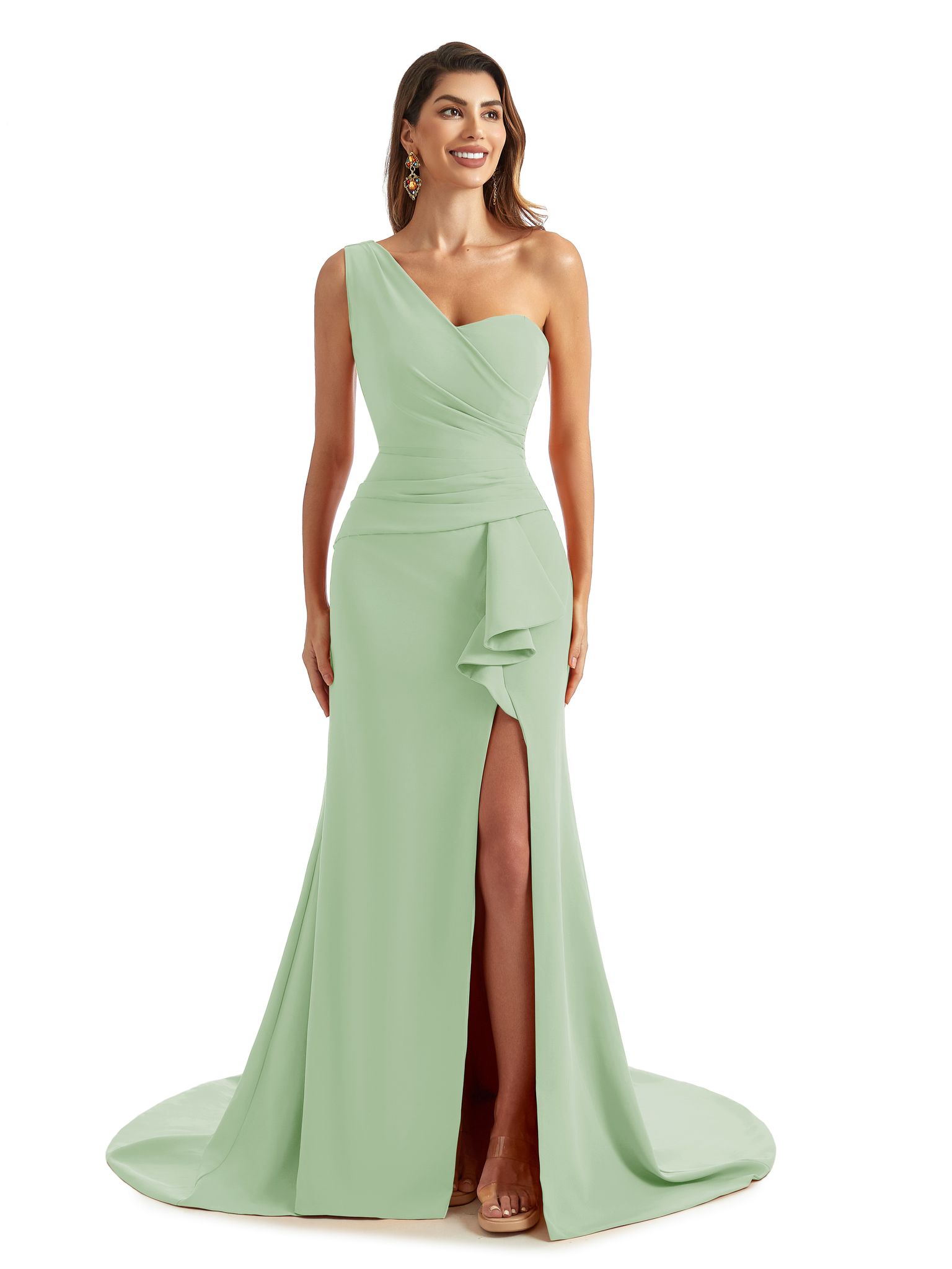 Sexy Side Split Mermaid One Shoulder Stretchy Crepe Long Formal Bridesmaid Dresses