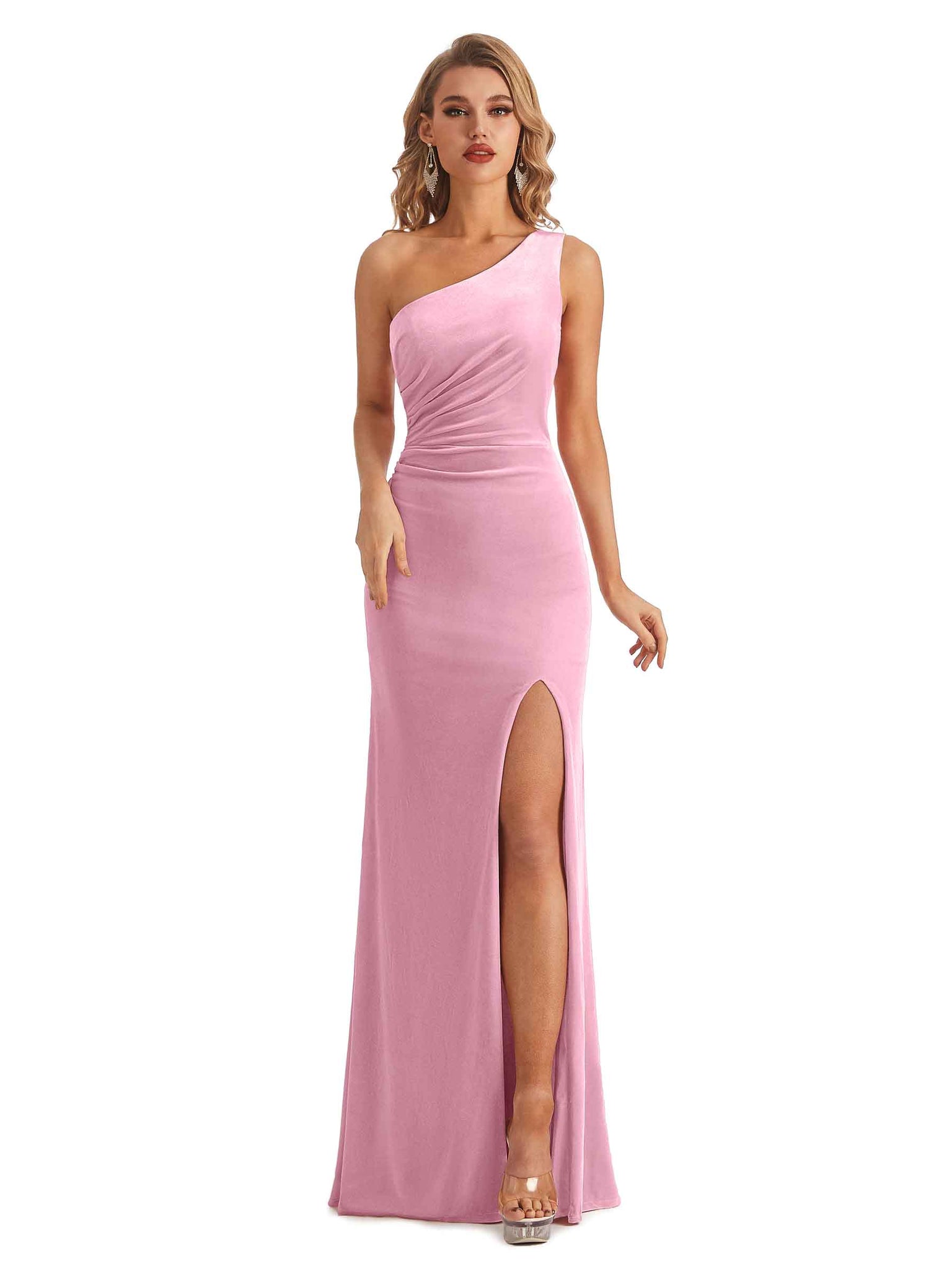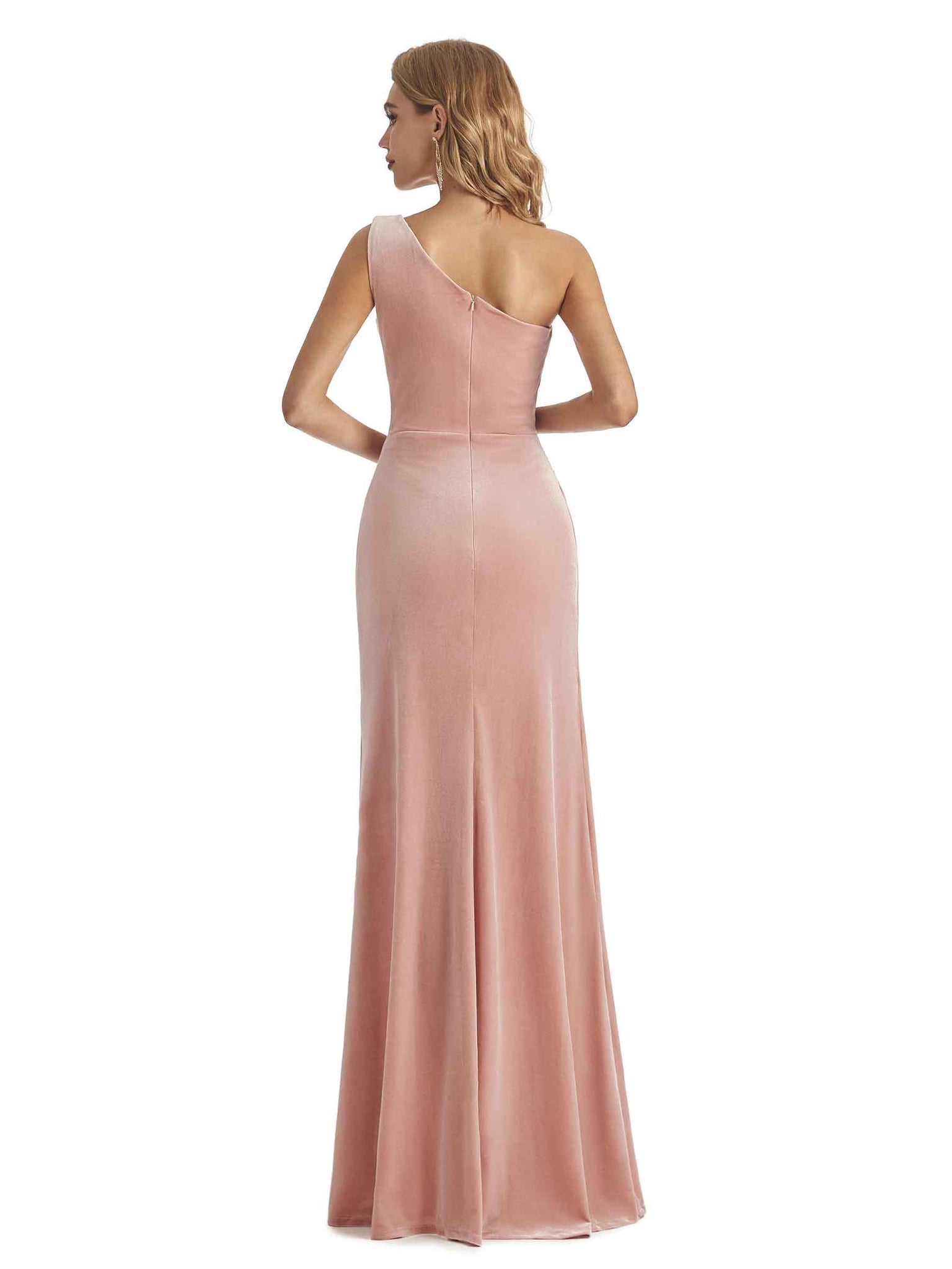 Elegant Mermaid One Shoulder Unique Velvet Side Slit Long Bridesmaid Dresses
