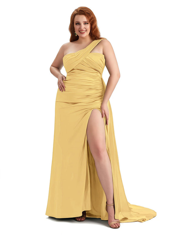 Plus Size One Shoulder Sexy Side Slit Mermaid Soft Satin Long Bridesmaid Gowns