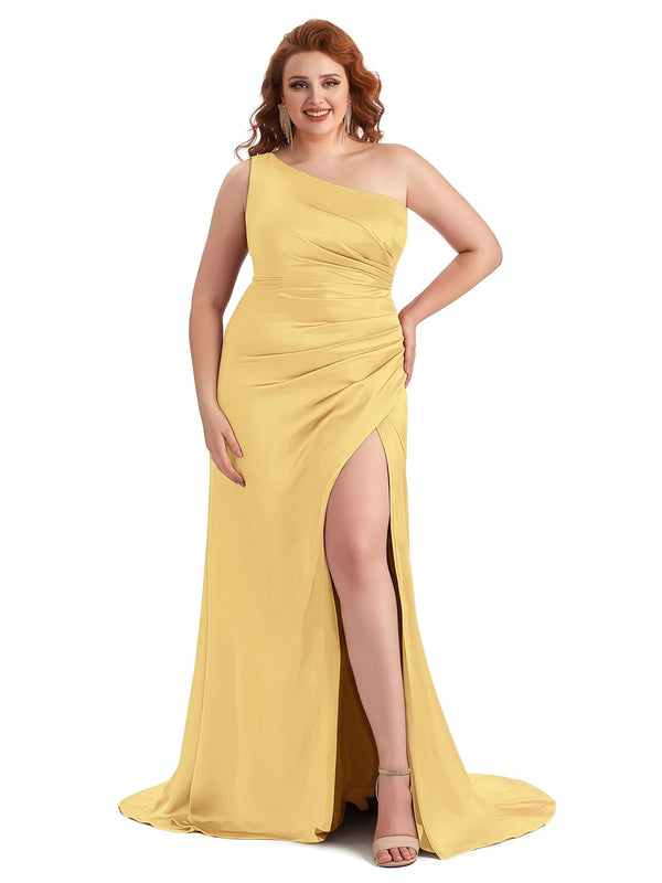 Plus Size Sexy One Shoulder Side Slit Mermaid Soft Satin Long Maid of Honor Dress For Wedding
