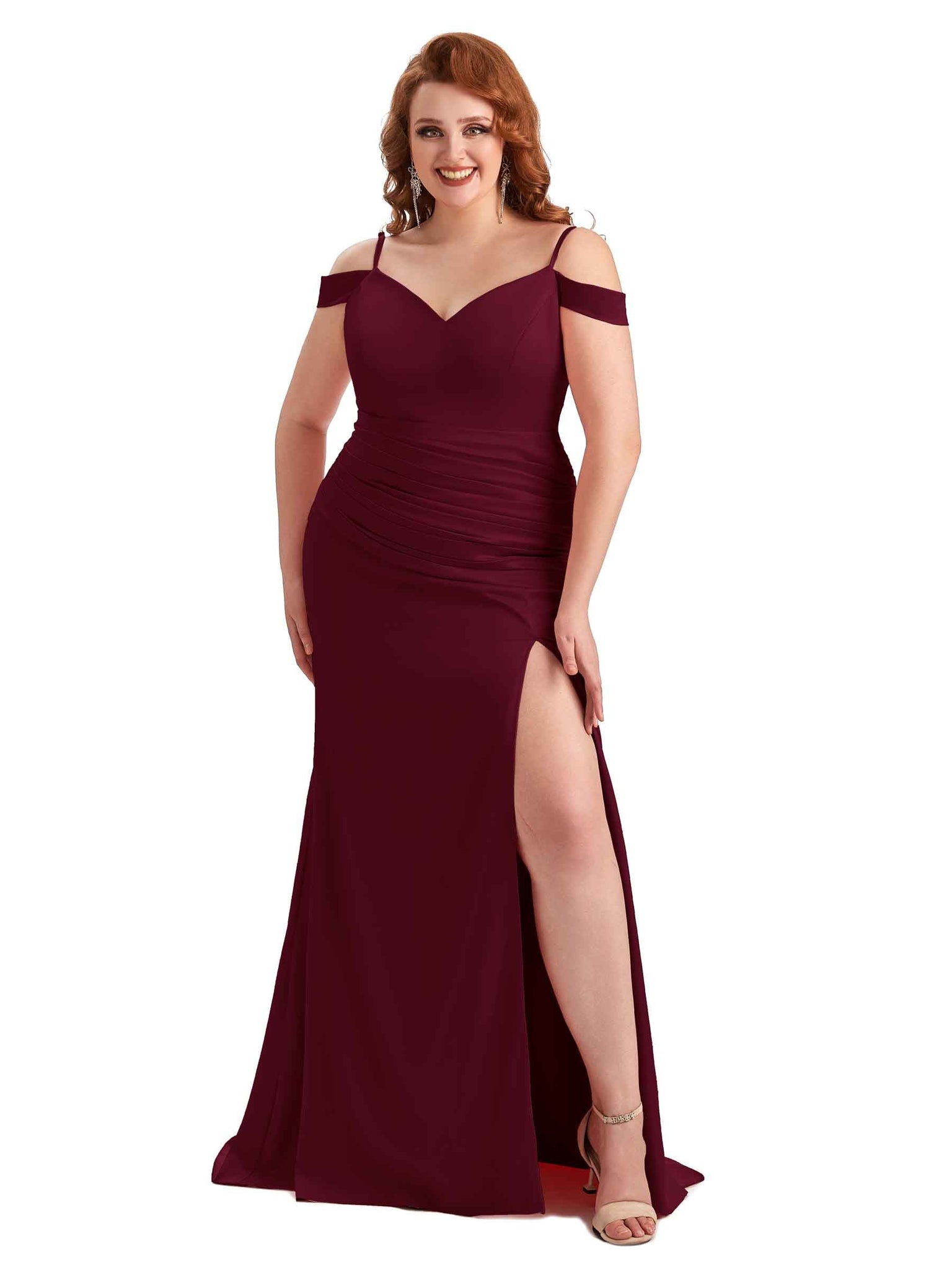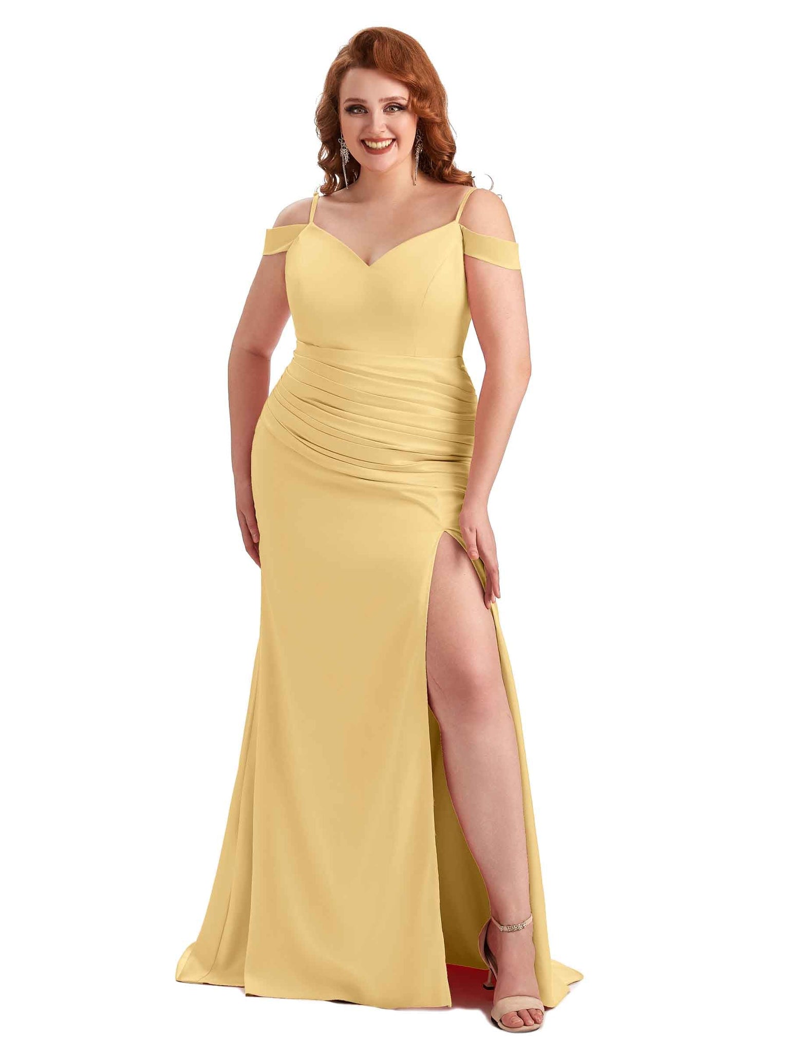 Plus Size Sexy Side Slit Mermaid Cold Shoulder Soft Satin Long Bridesmaid Dresses Online