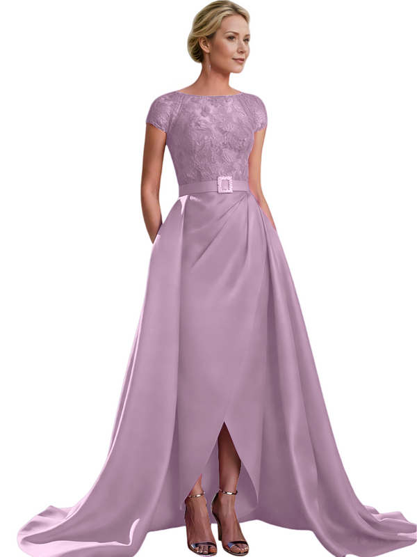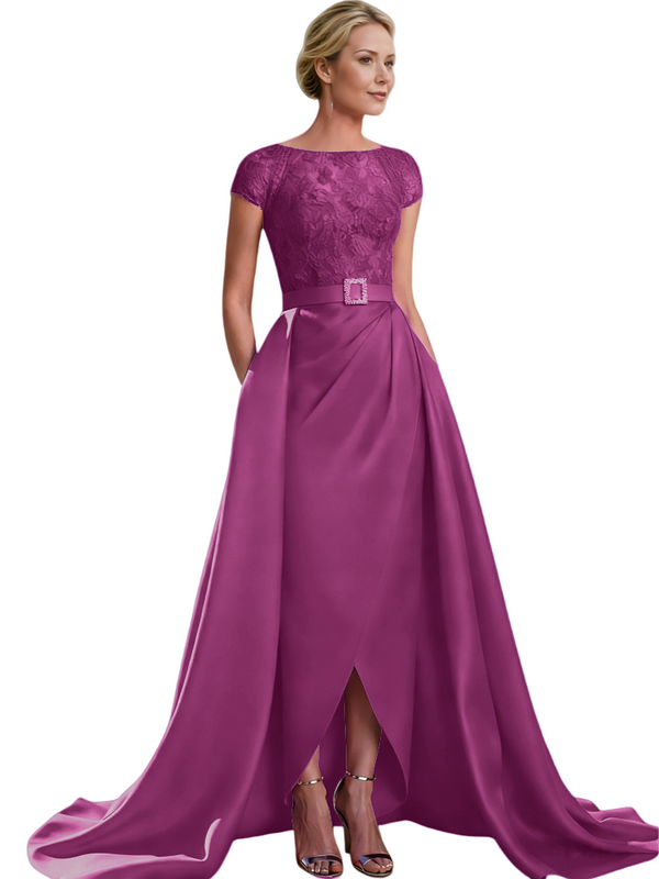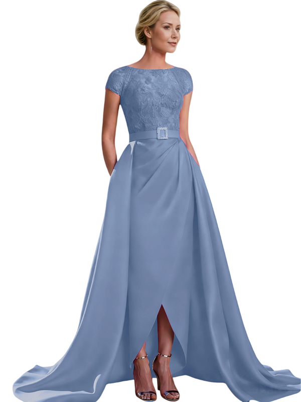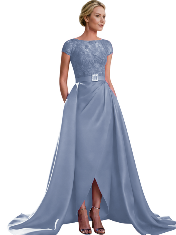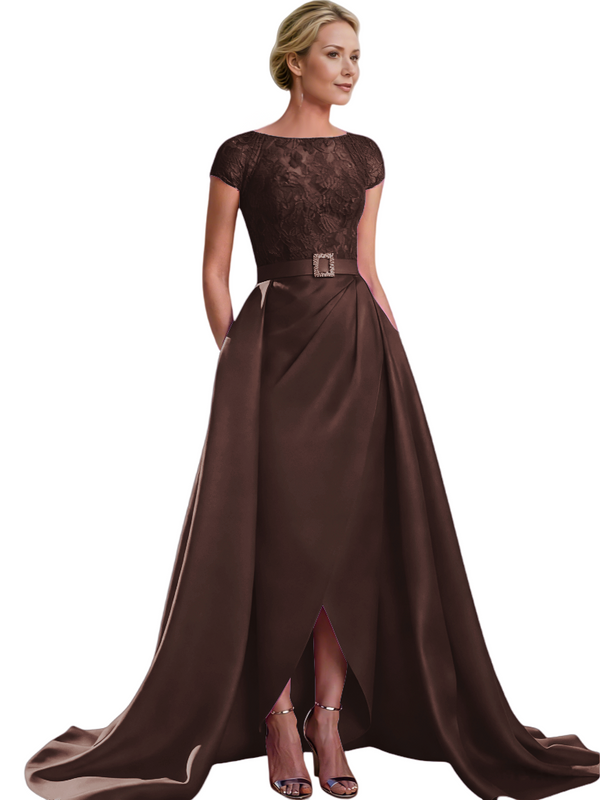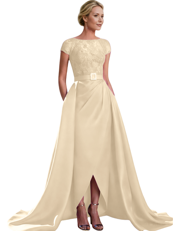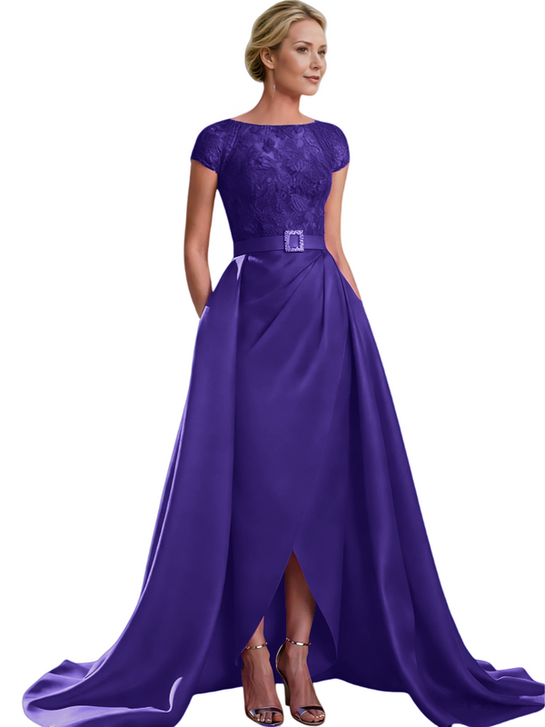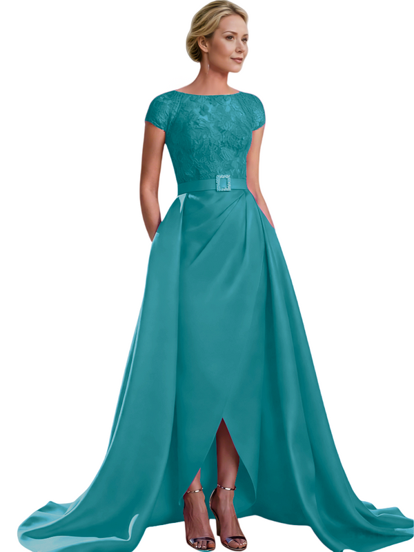 Elegant Cap Sleeves Jewel Lace And Satin For Mother Of The Bride With Train
