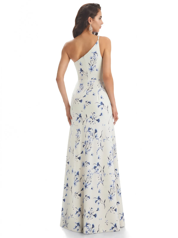 Elegant One Shoulder Mermaid Long Satin Floral Formal Dresses For Women