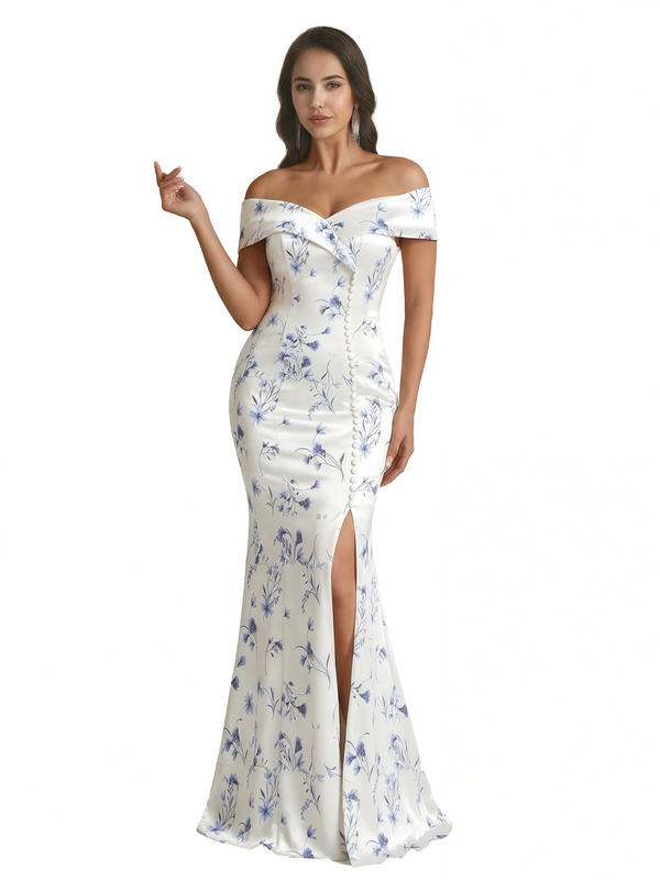 Sexy Off Shoulder Mermaid Long Satin Floral Formal Dresses For Women