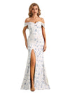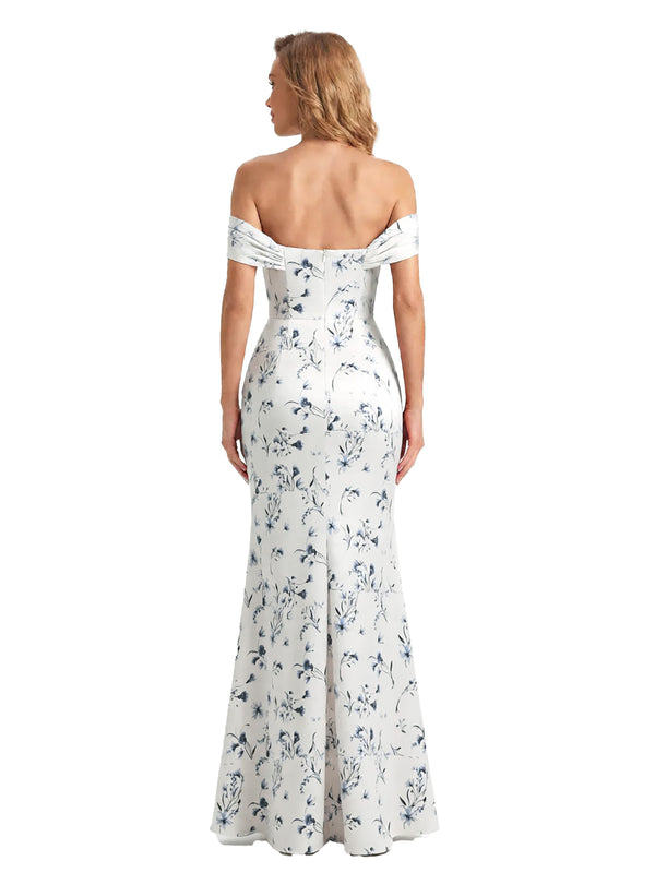 Trendy Off Shoulder Side Slit Mermaid Long Satin Floral Formal Evening Dresses For Ladies