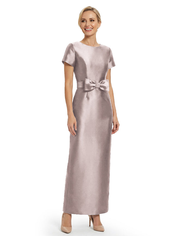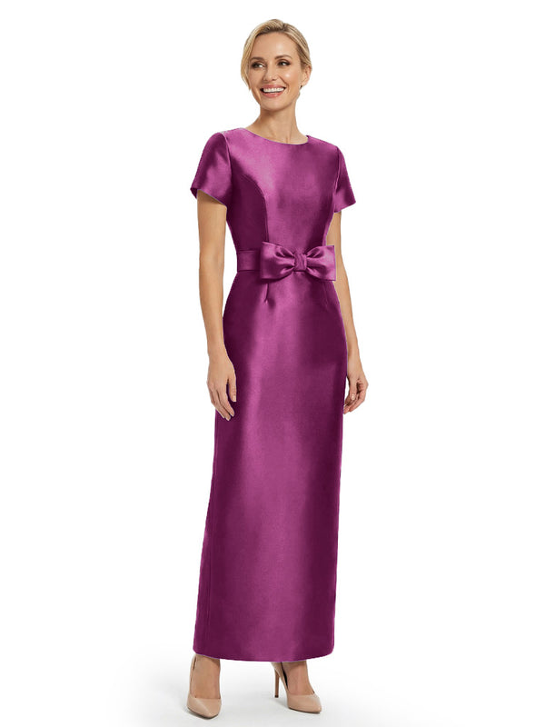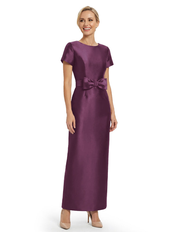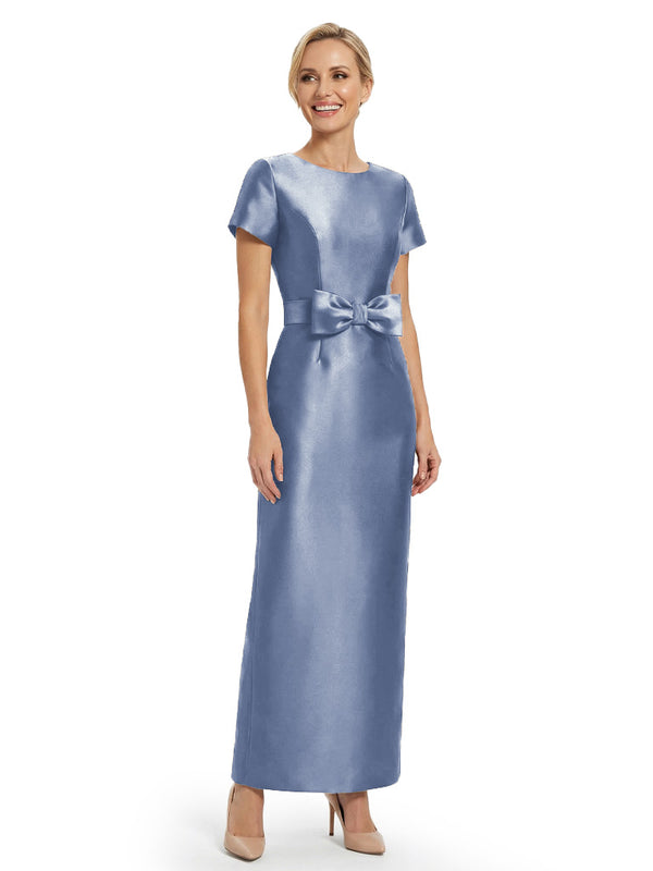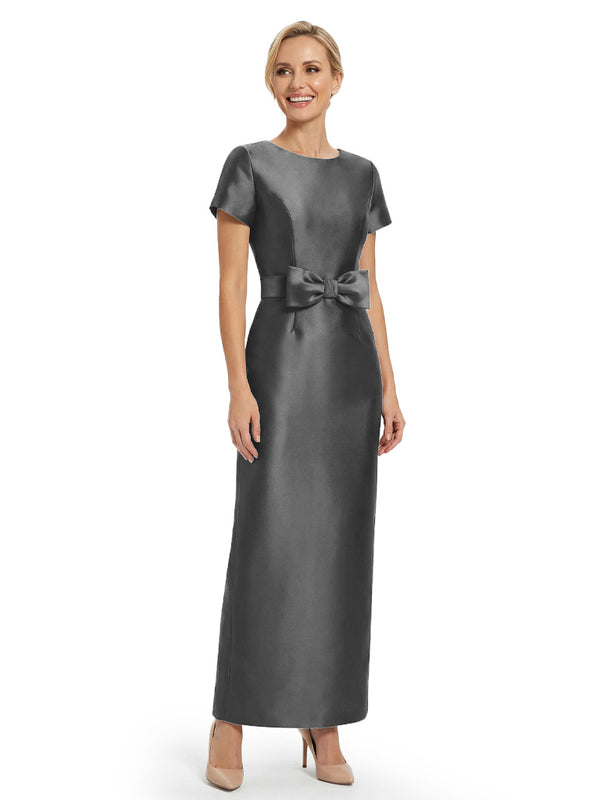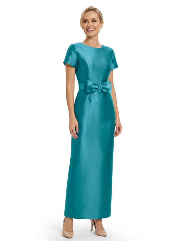 Beautiful Jewel Short Sleeves Satin Bow Knot Slit Sheath Mother Of The Bride Dresses