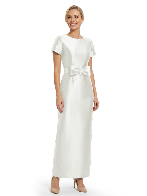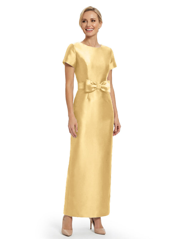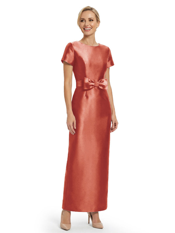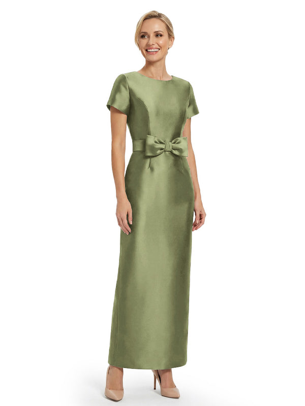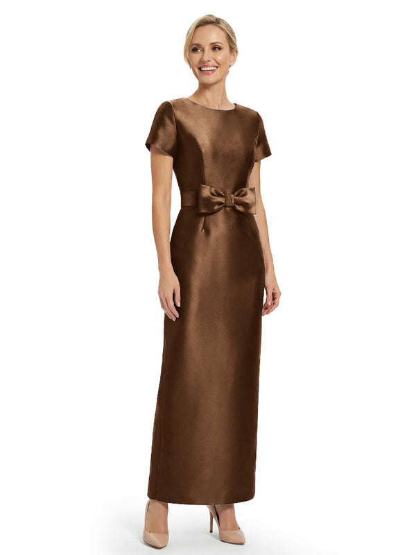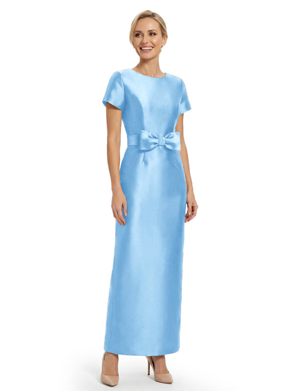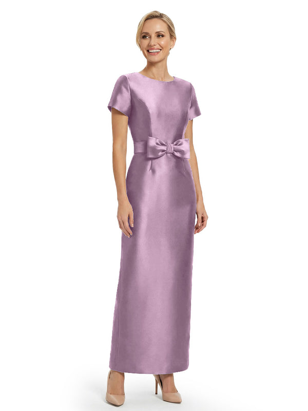 Beautiful Jewel Short Sleeves Satin Bow Knot Slit Sheath Mother Of The Bride Dresses