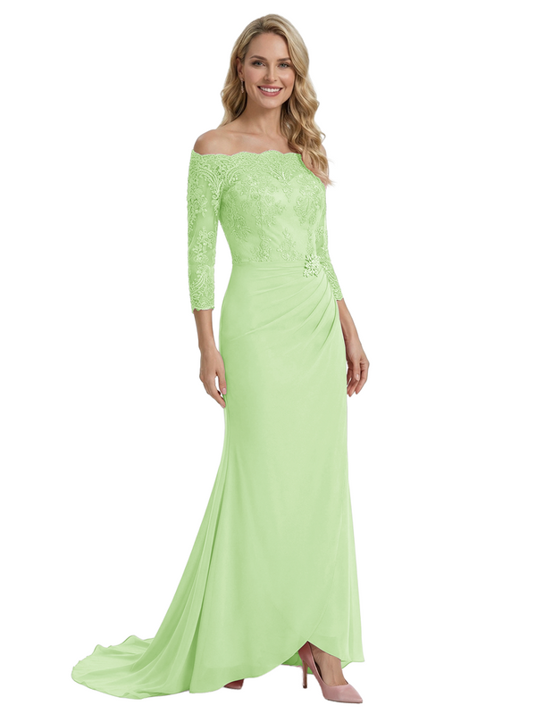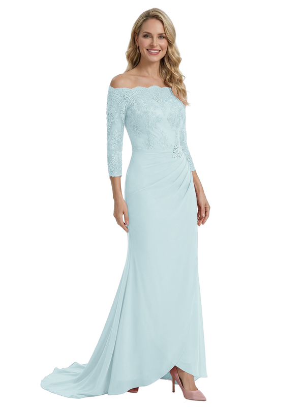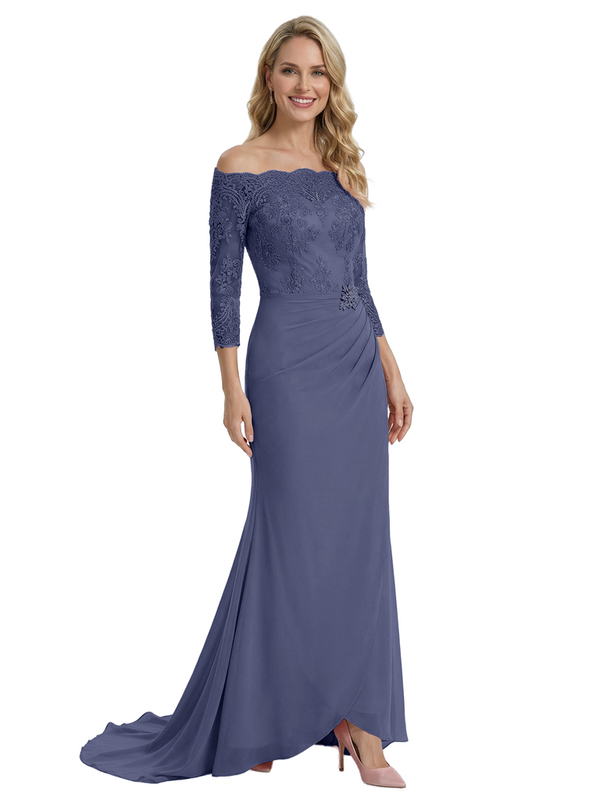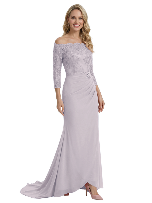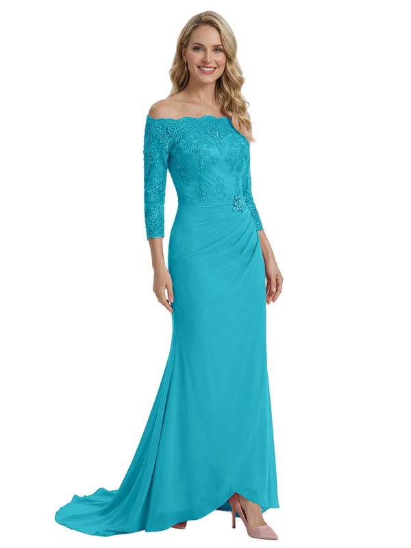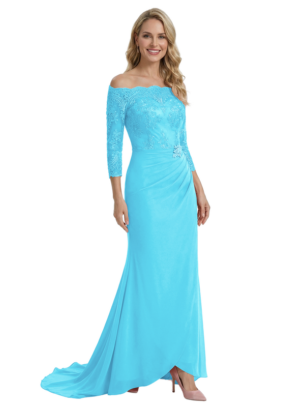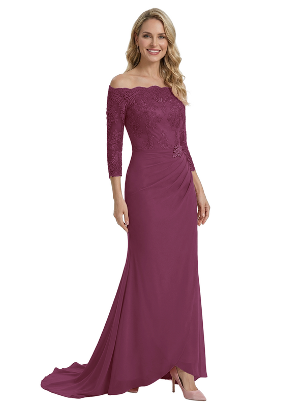 Elegant Off Shoulder 3/4 Sleeves Mermaid Chiffon Mother Of The Bride Dress With Lace Appliques