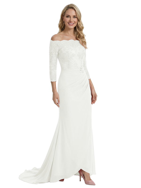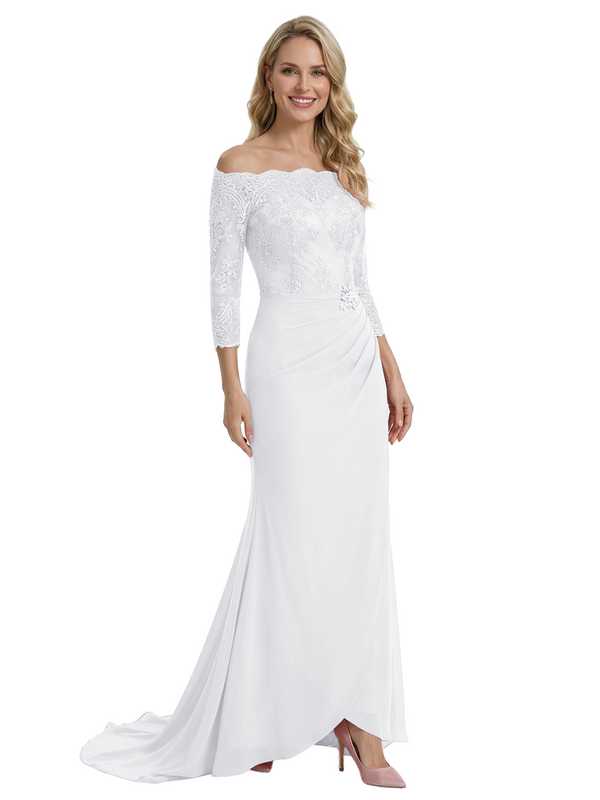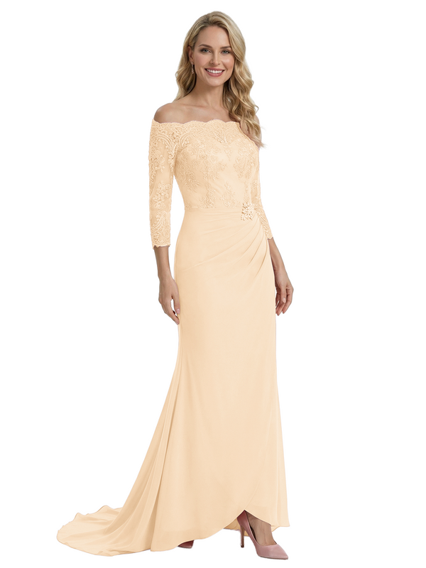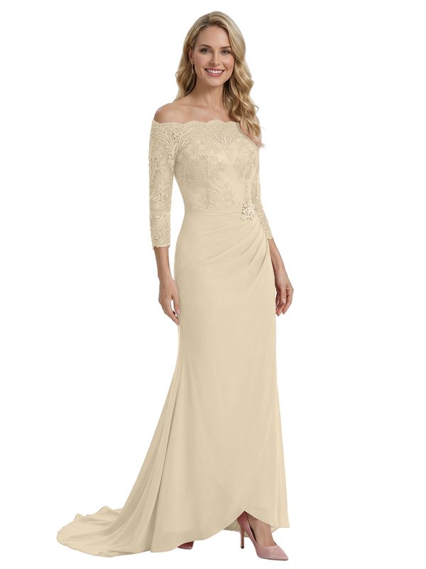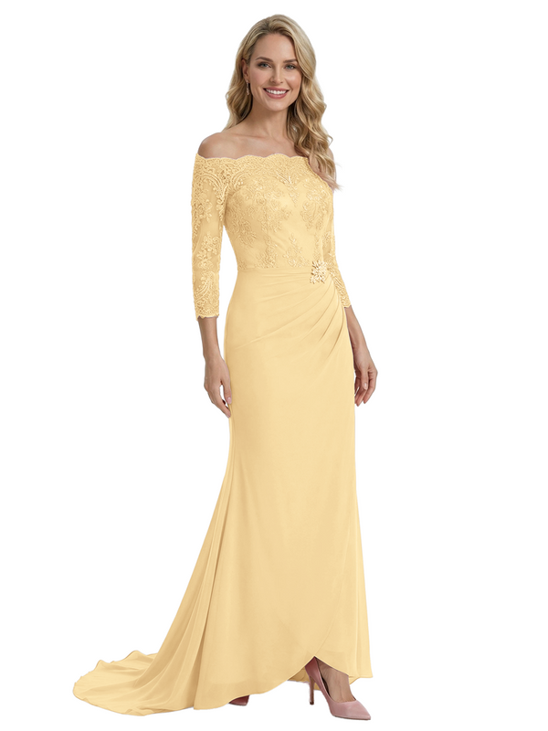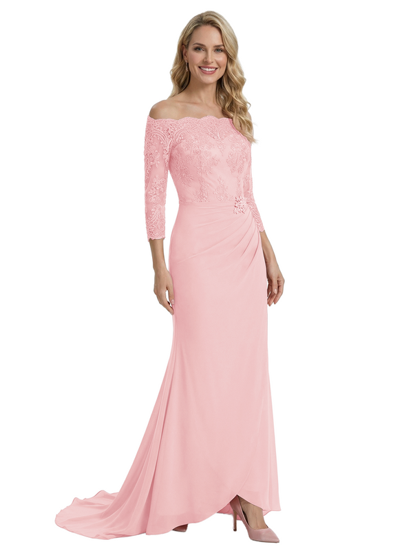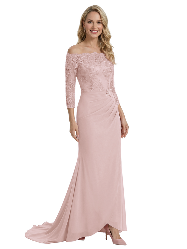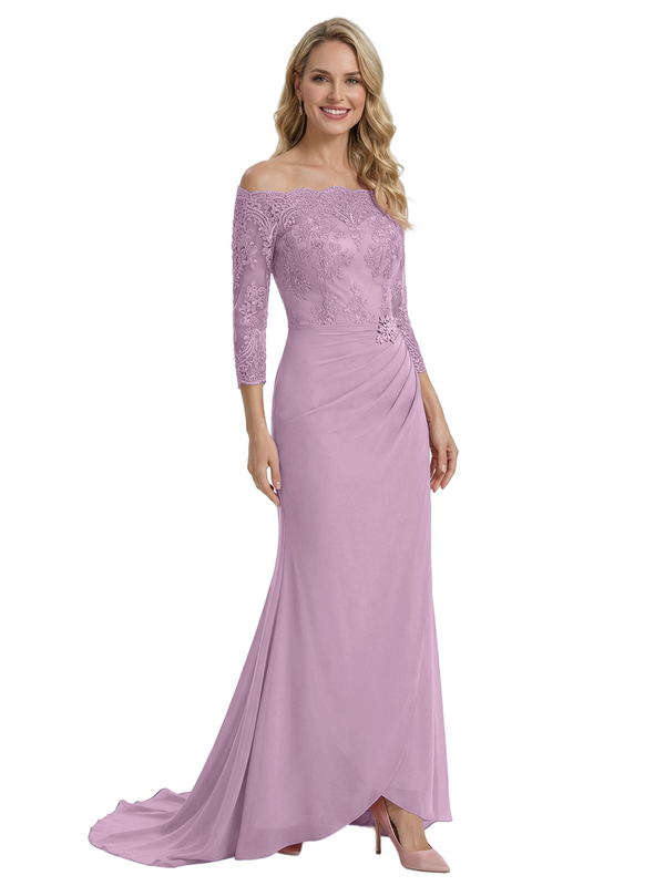 Elegant Off Shoulder 3/4 Sleeves Mermaid Chiffon Mother Of The Bride Dress With Lace Appliques