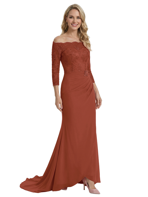 Elegant Off Shoulder 3/4 Sleeves Mermaid Chiffon Mother Of The Bride Dress With Lace Appliques $159.99