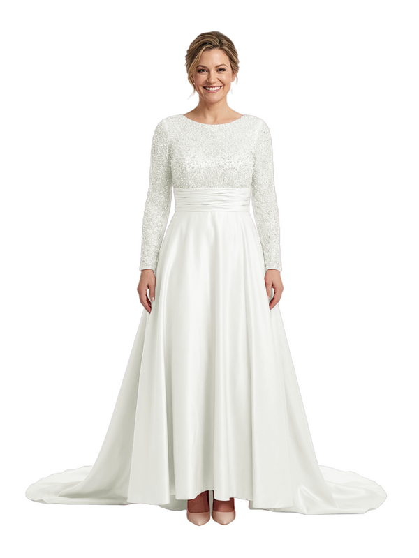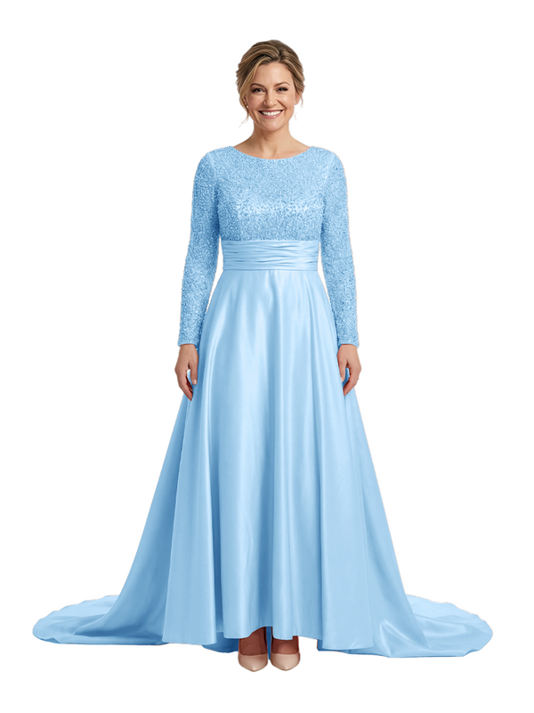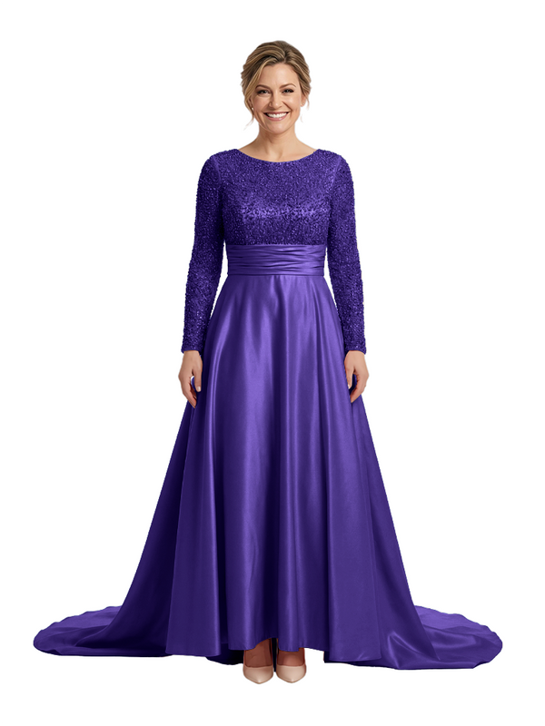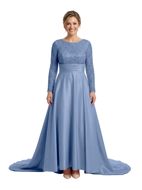 Mother of The Bride Dress Scoop Long Sleeve Sequin Satin Floor-Length Gown Wedding Guest Attire