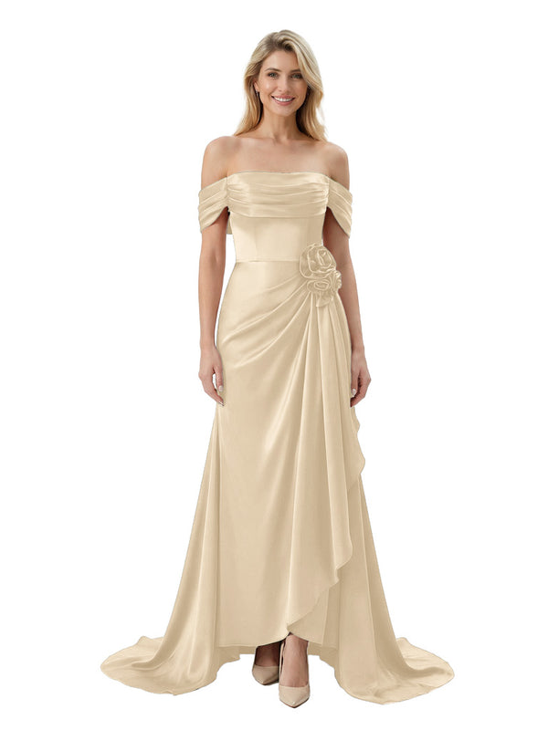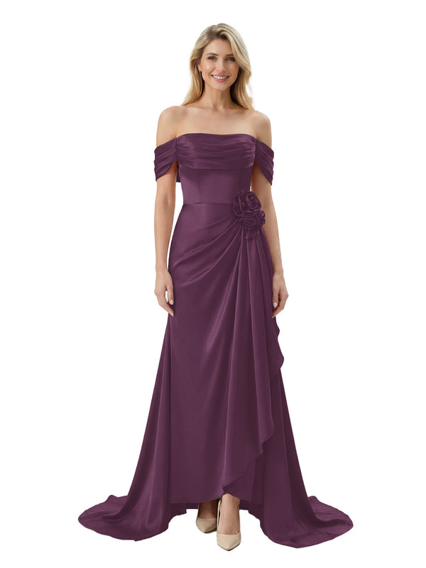 Off The Shoulder Ruching Satin Mother Of The Groom Dress Mermaid Maxi Gown With Floral Accent Train