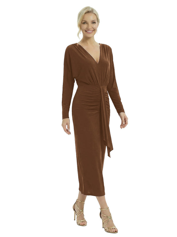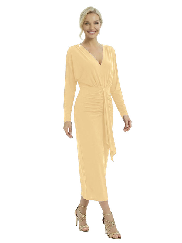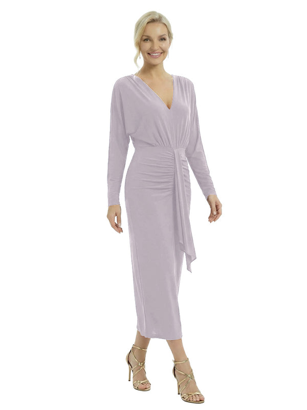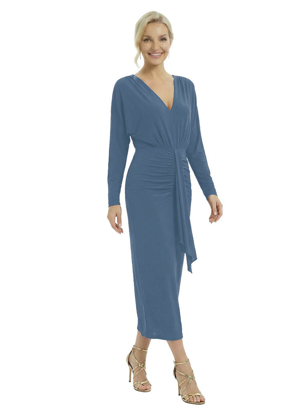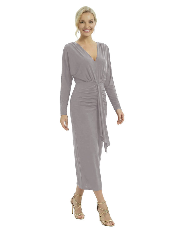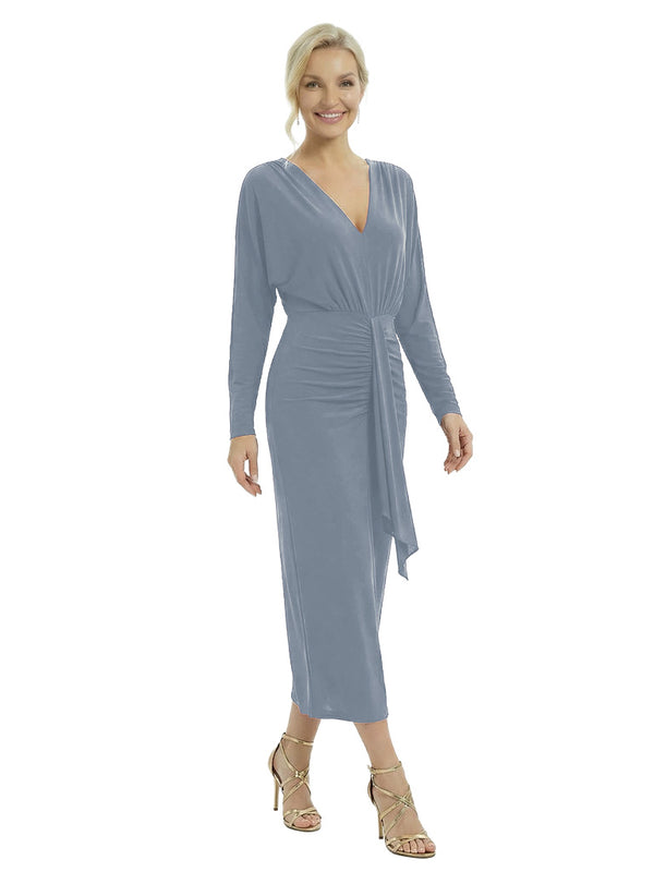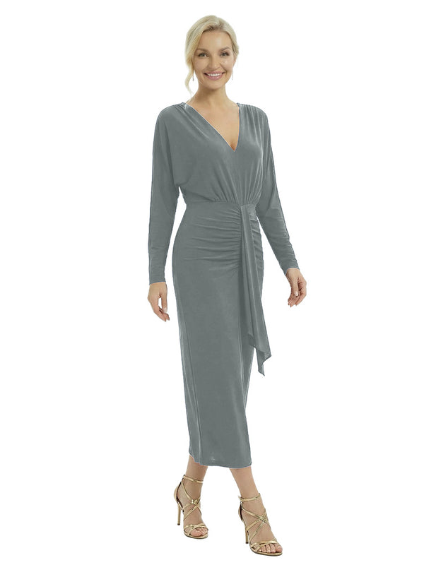 Sophisticated V-Neck Long Sleeves Ruched Chiffon Ankle-Length Sheath Mother Of The Groom Evening Dress $149.99