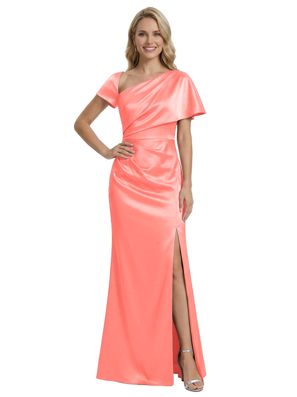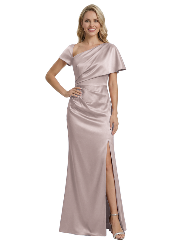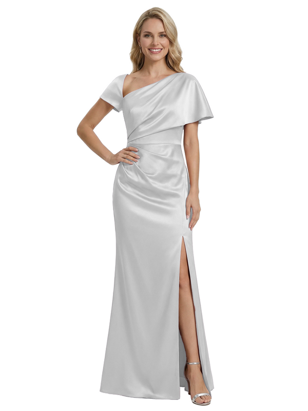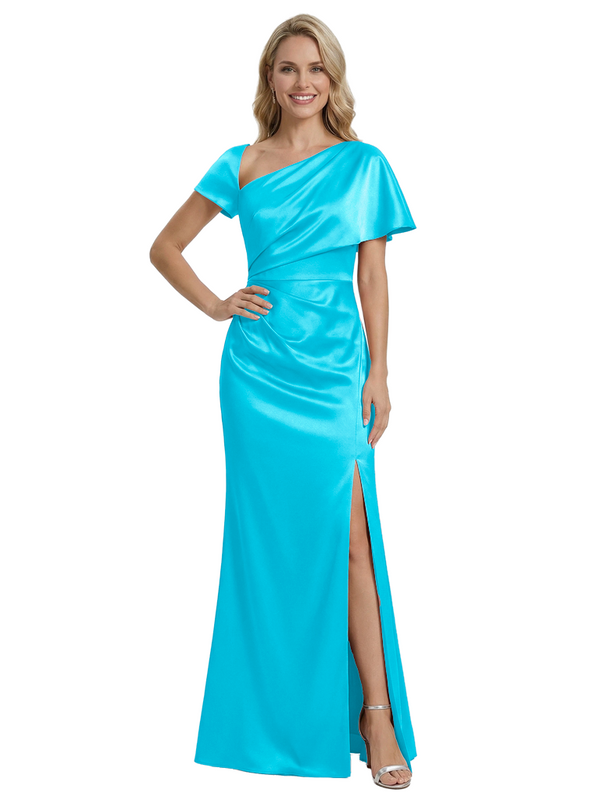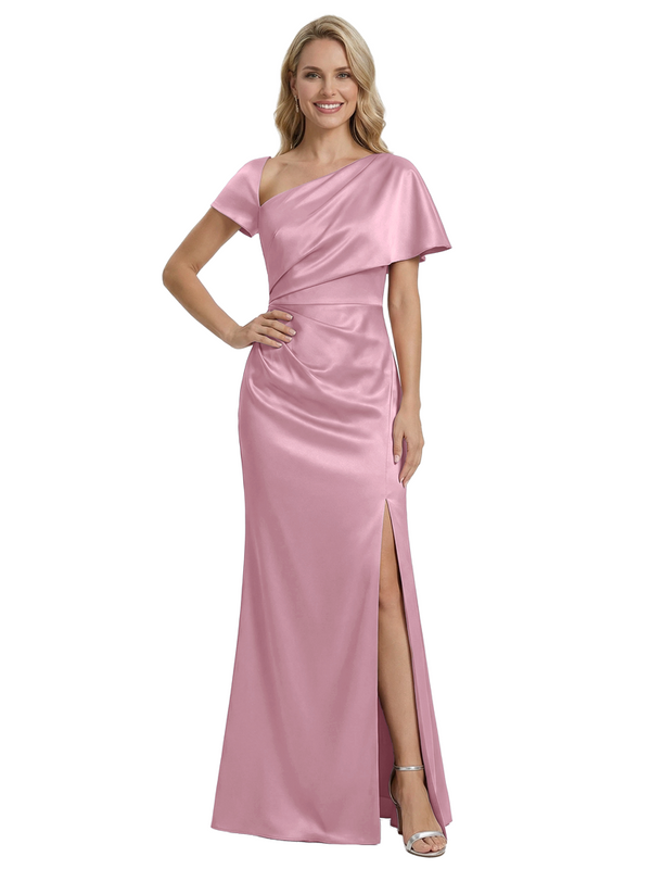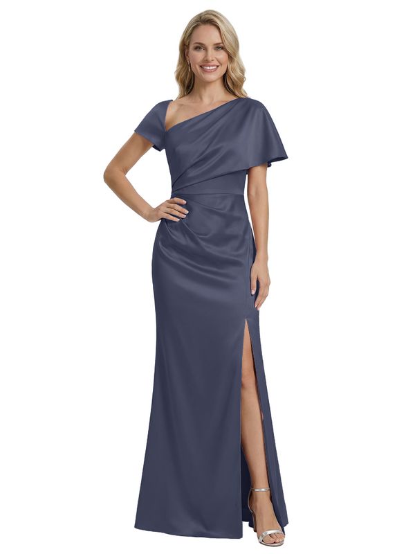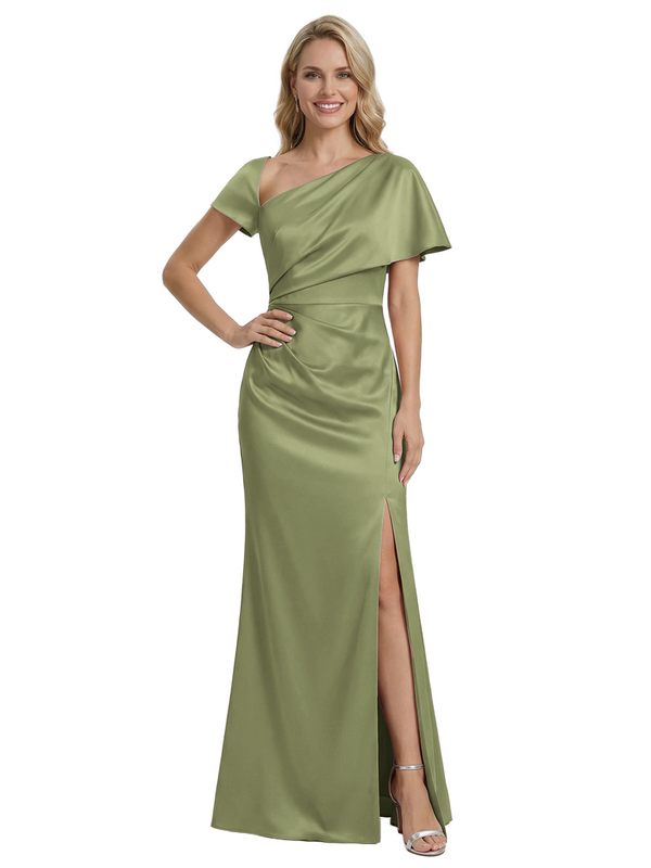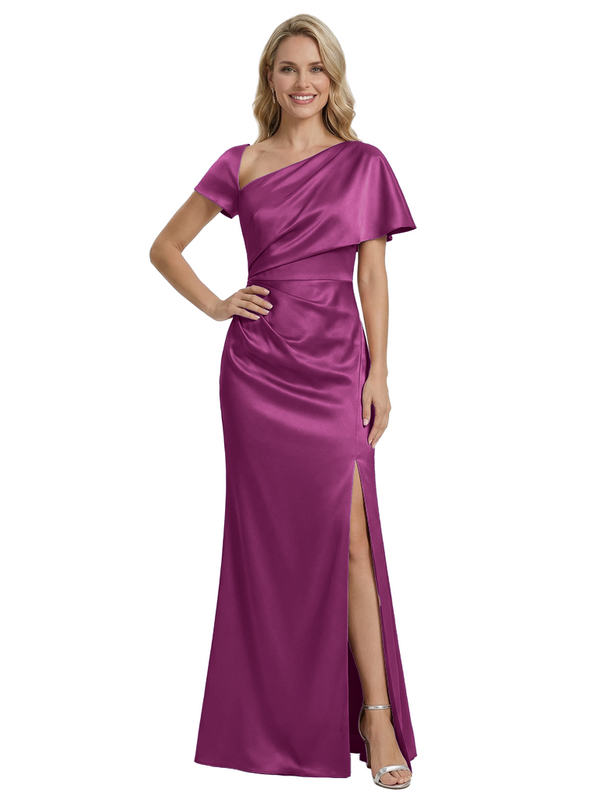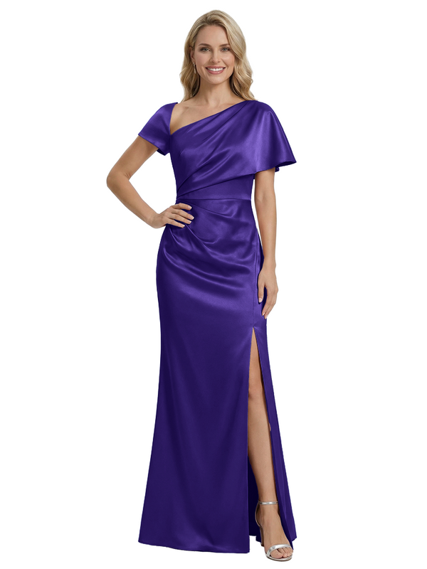 Stylish One Shoulder Asymmetric Short Sleeve Side Slit Mermaid Mother of The Bride Dress Satin Maxi Gown