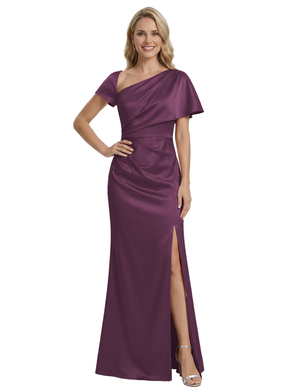 Stylish One Shoulder Asymmetric Short Sleeve Side Slit Mermaid Mother of The Bride Dress Satin Maxi Gown $149.99