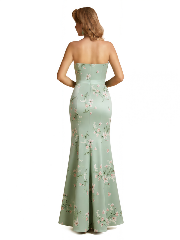 Elegant Strapless Side Slit Mermaid Long Satin Floral Formal Dresses For Women