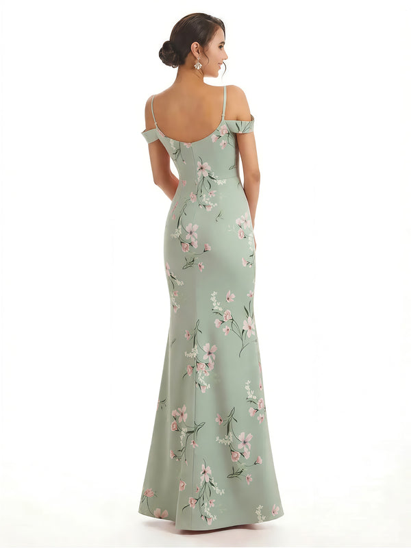 Trendy Cold Shoulder Side Slit Mermaid Floral Satin Maxi Floral Formal Dresses For Ladies