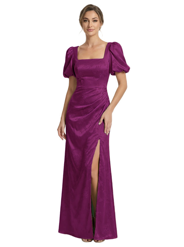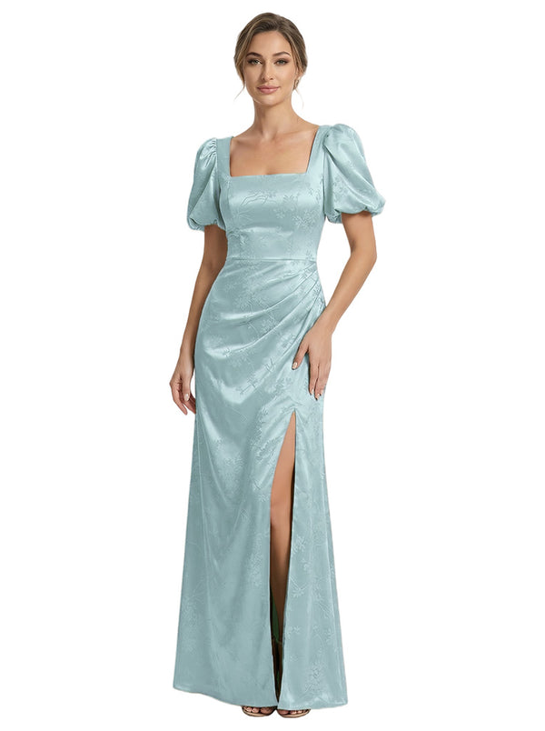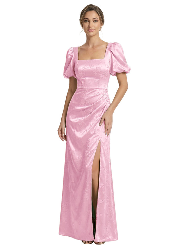 Elegant Jacquard Satin Side Slit Square neckline Mermaid Short Sleeves Long Formal Evening Dresses