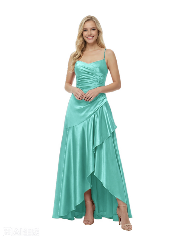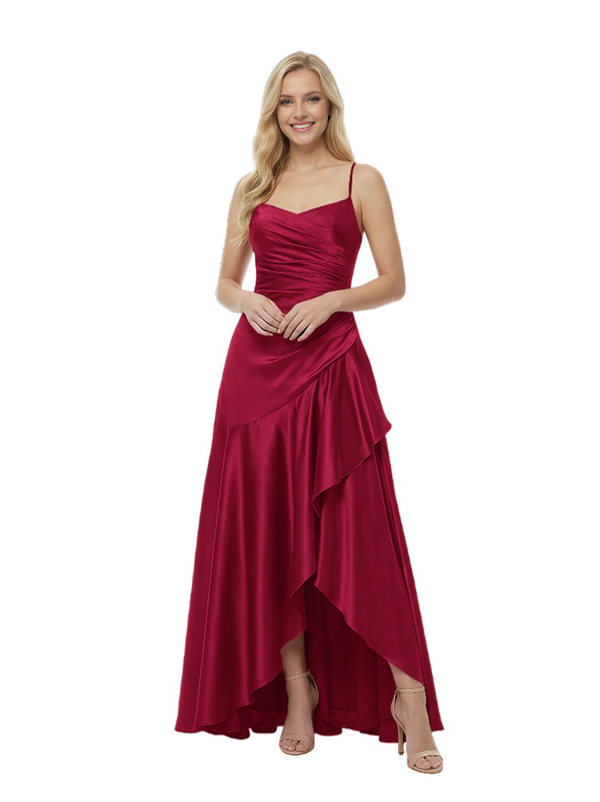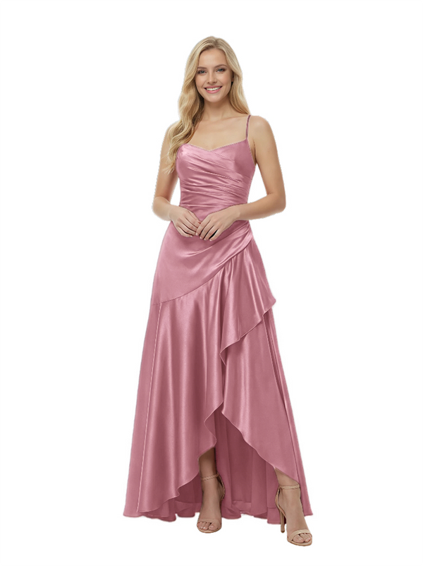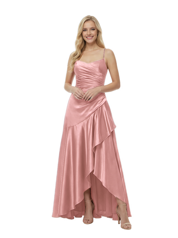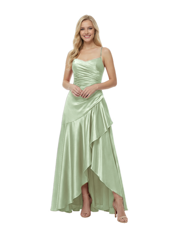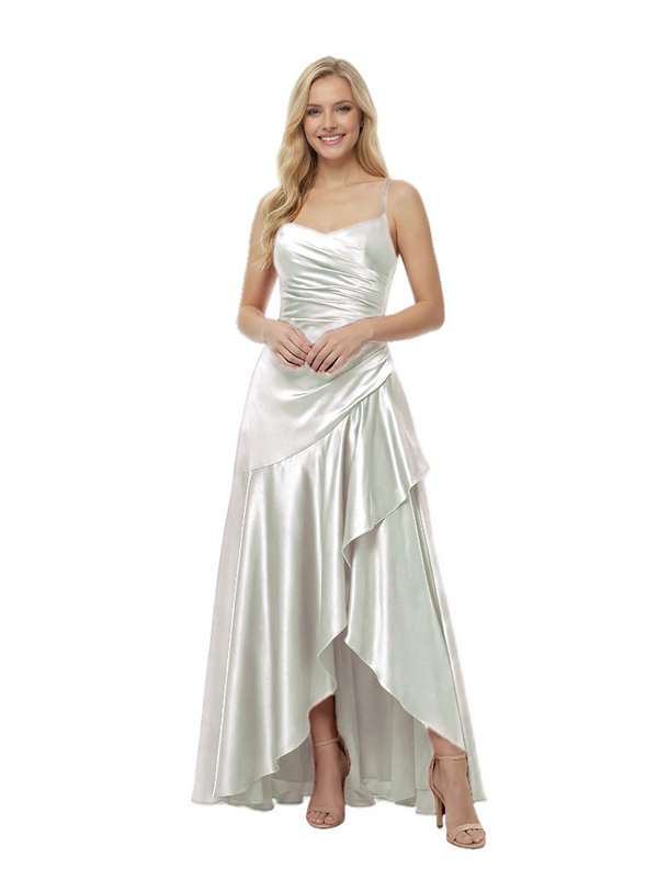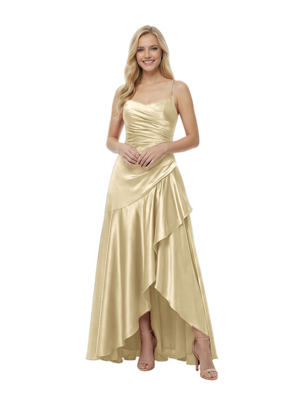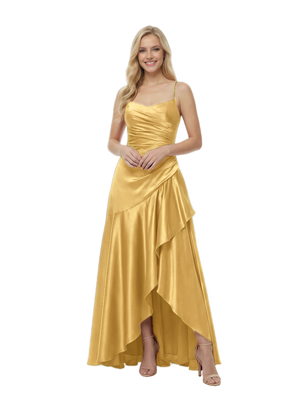 Elegant Spaghetti Straps Ruched High-Low Asymmetric Satin Prom Gown