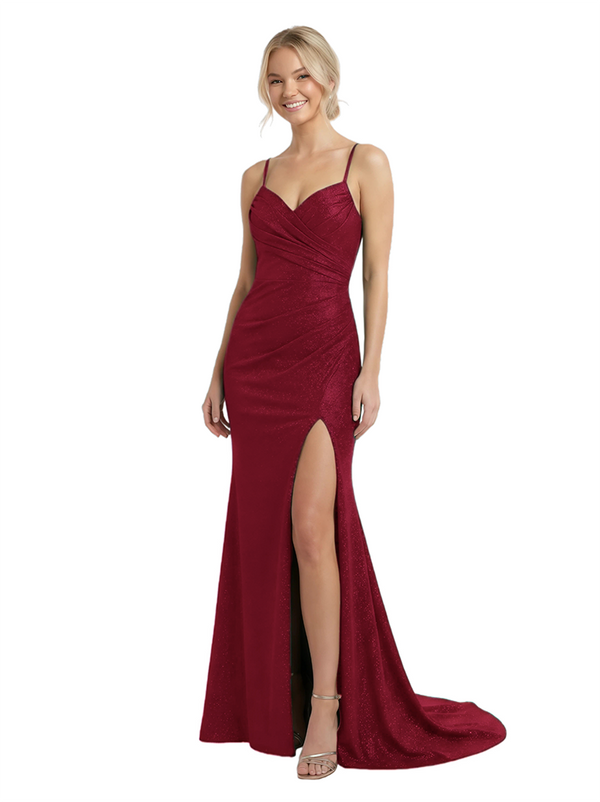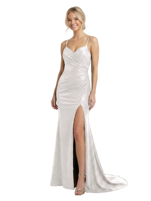 Sparkly Spaghetti Straps Glitter Jersey V-neck Mermaid Side Slit Ruched Evening Prom Dresses