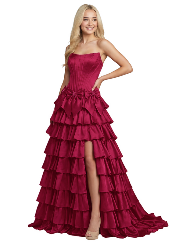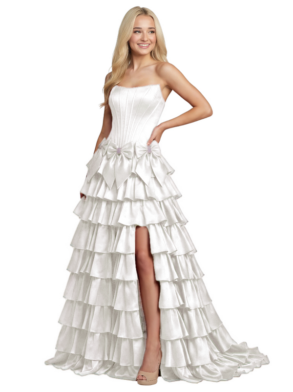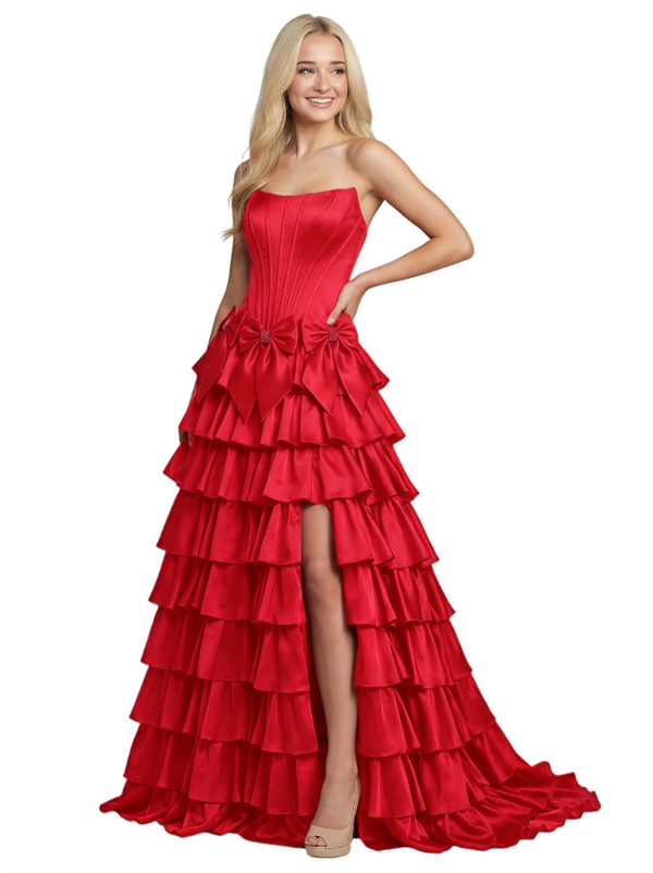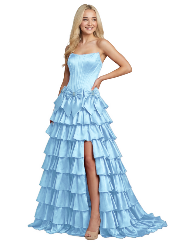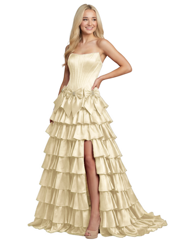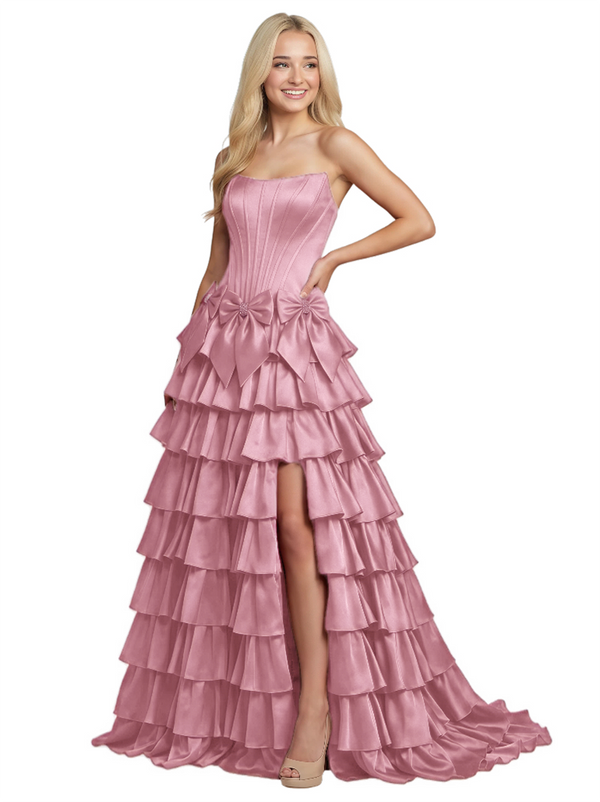 Unique Tiered Ruffle A-Line Satin Bow Knot Strapless Boning Prom Dress