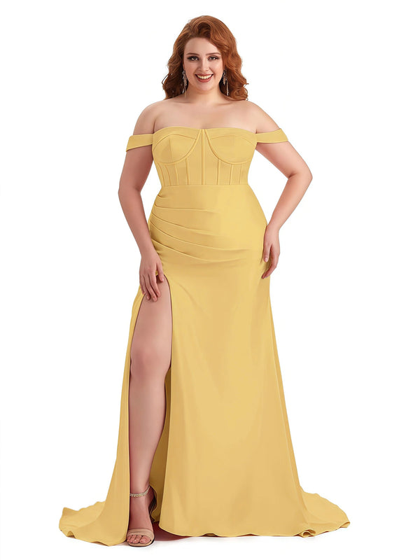 Plus Size Elegant Off The Shoulder Side Slit Mermaid Soft Satin Long Bridesmaid Gowns