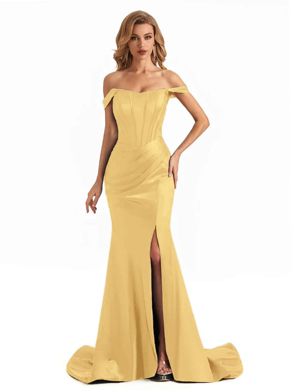 Sexy Side Slit Soft Satin Off The Shoulder Long Mermaid Bridesmaid Dresses