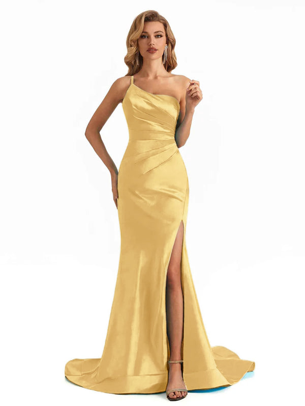 Sexy Side Slit Soft Satin One Shoulder Spaghetti Straps Long Maxi Mermaid Bridesmaid Dresses