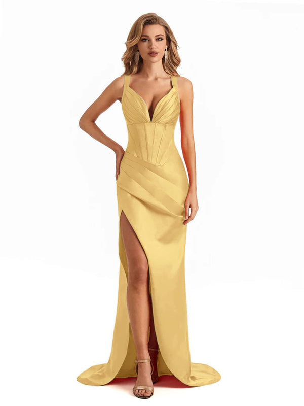 Sexy Side Slit Soft Satin Unique Spaghetti Straps V-Neck Long Mermaid Bridesmaid Dresses