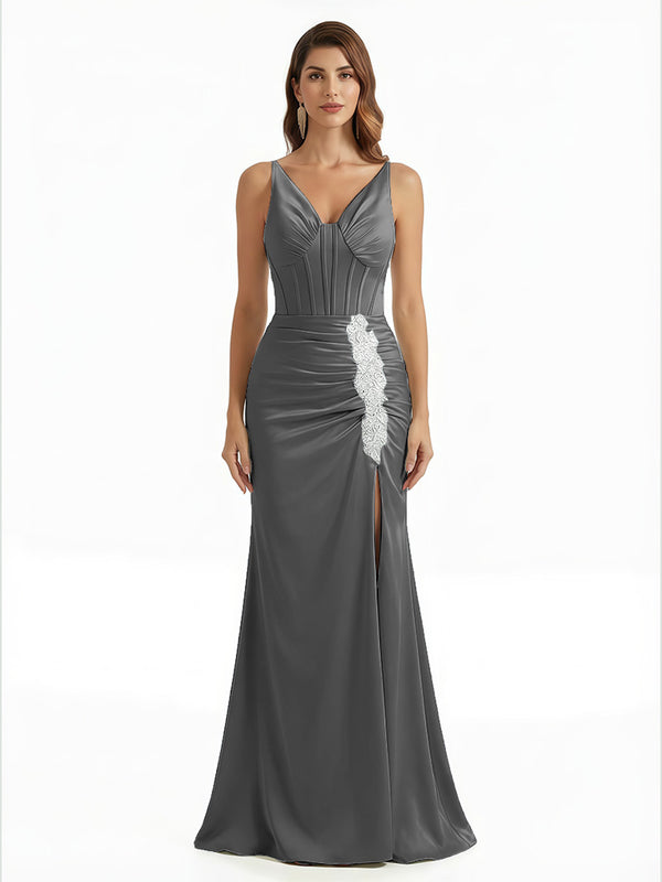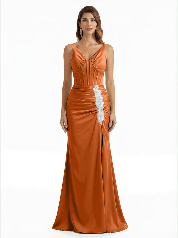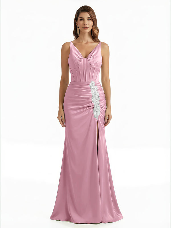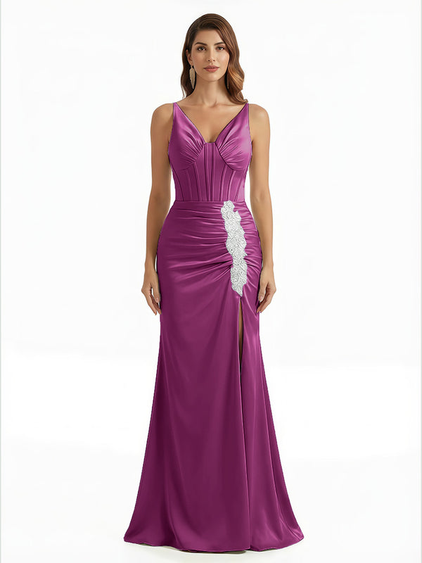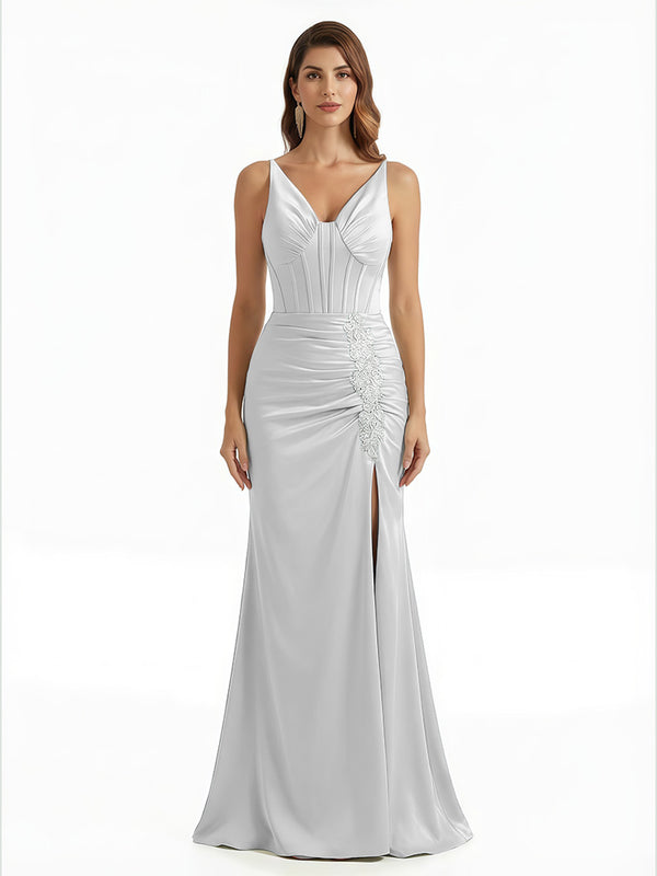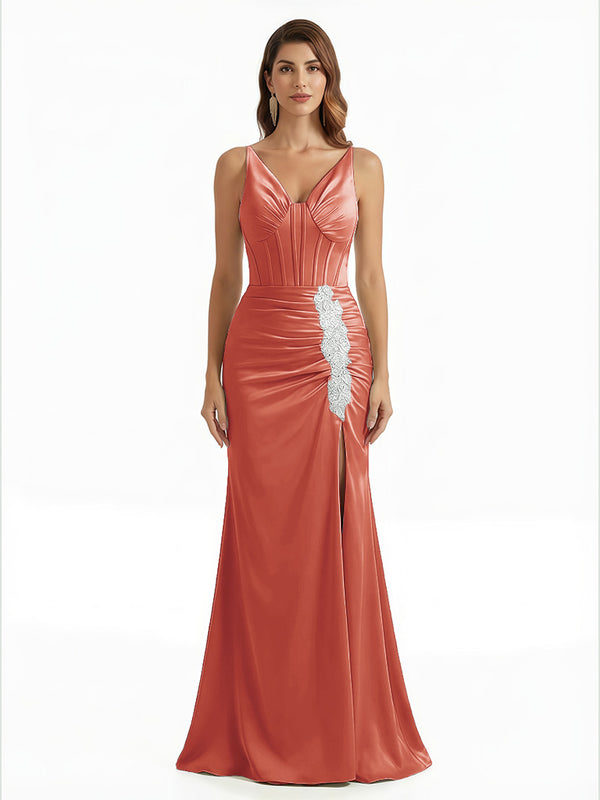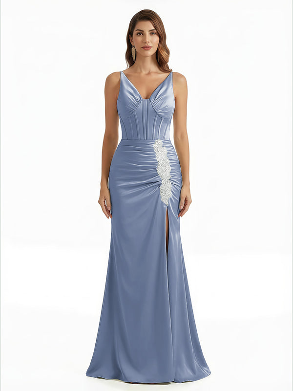 Elegant V-Neck Boning Silky Satin Mermaid Long Evening Gown Dresses For Women