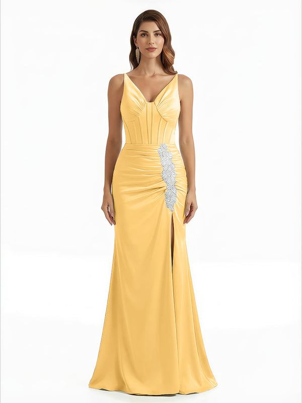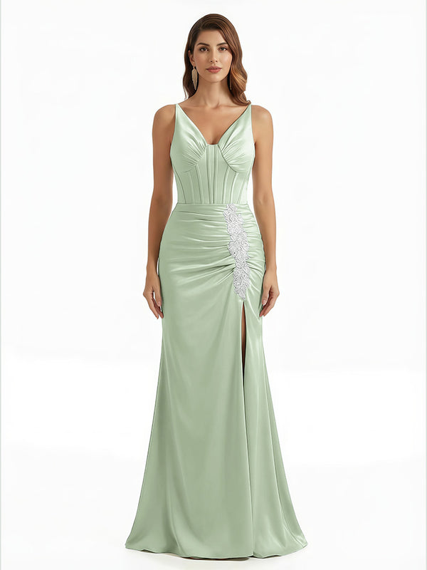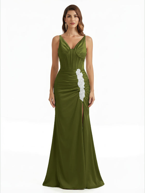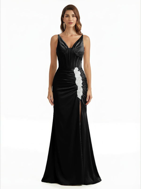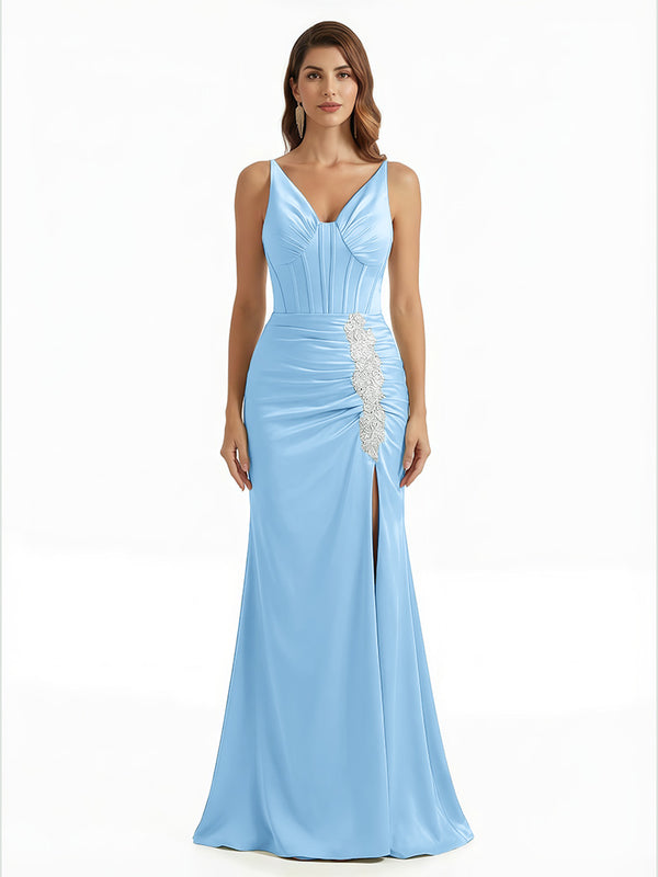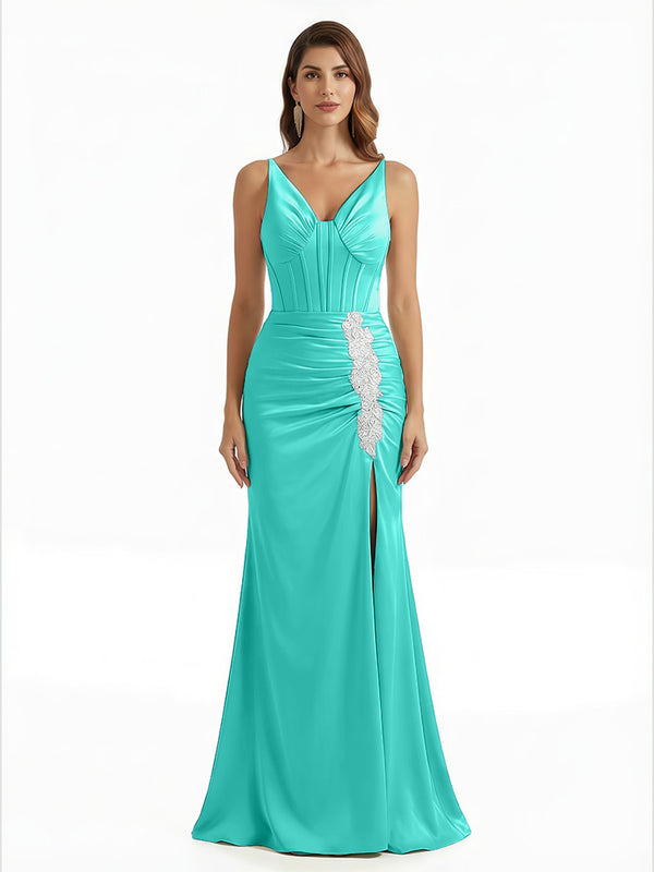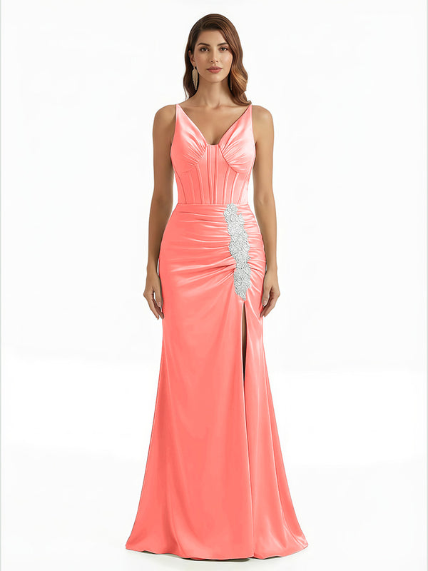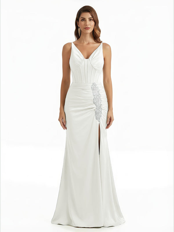 Elegant V-Neck Boning Silky Satin Mermaid Long Evening Gown Dresses For Women