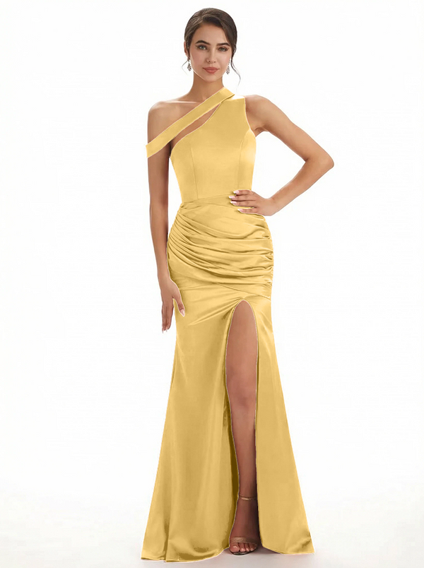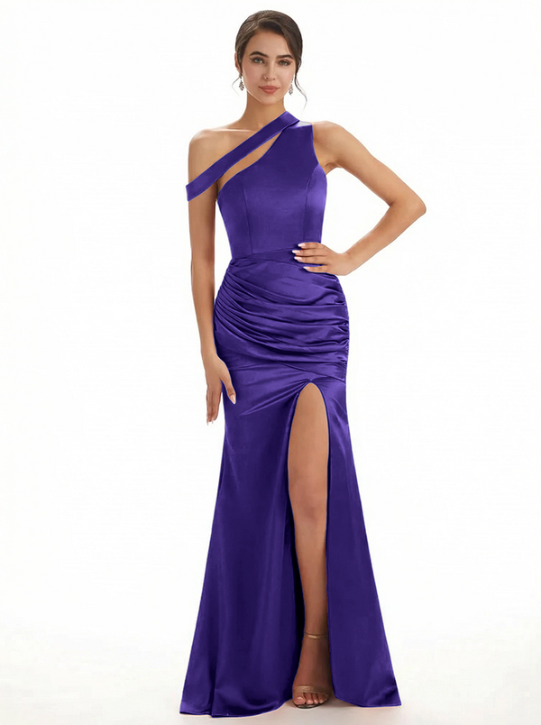 Women's One Shoulder Asymmetrical Mermaid Ruched Satin Long Formal Dresses Side Slit