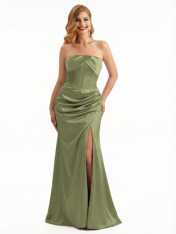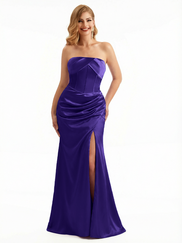Women's Sexy Strapless Boning Mermaid Ruched Satin Long Formal Dresses Side Slit