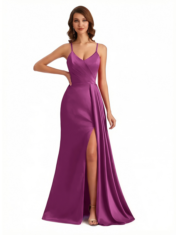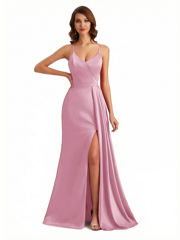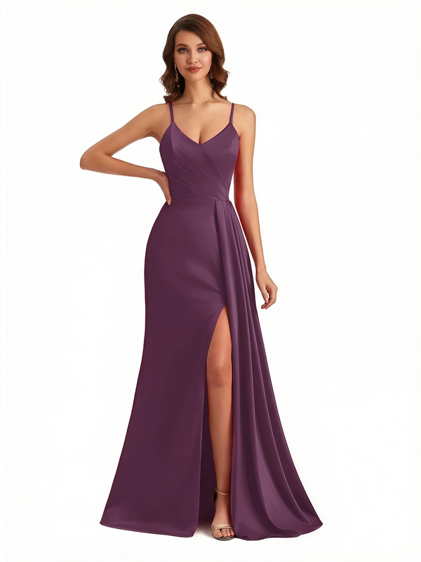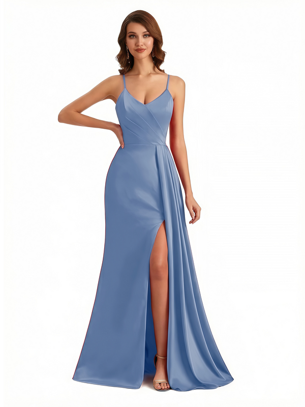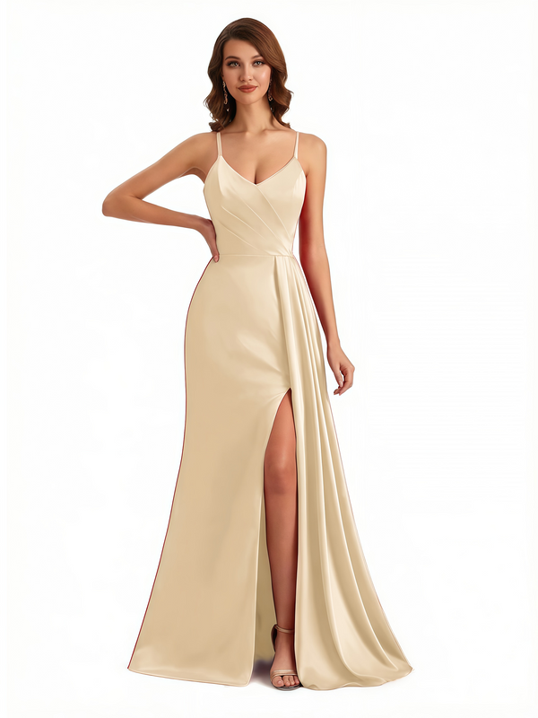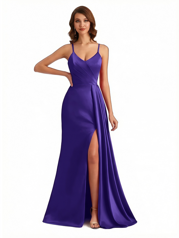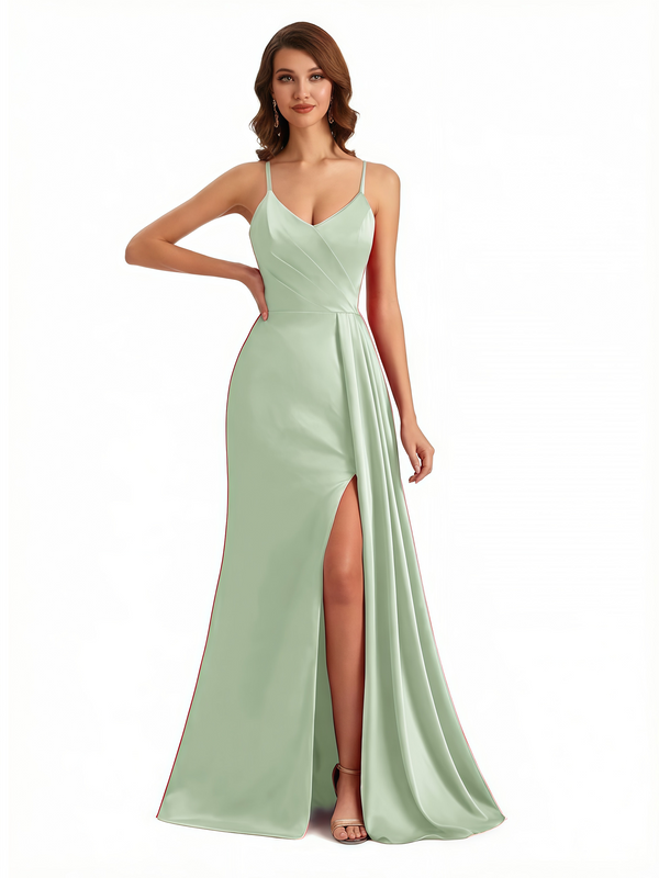 Women's Mermaid Ruched Satin Side Slit Long Formal Dresses With Waist Drape Spaghetti Straps V-Neck