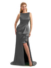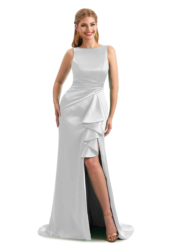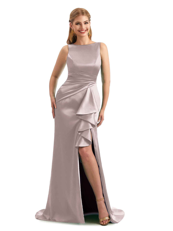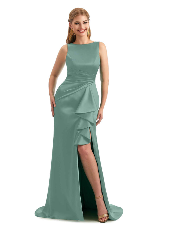 Scoop Ruffles Summer Satin Side Slit Bridesmaid Dresses