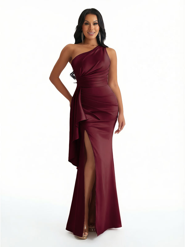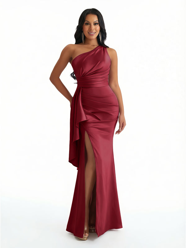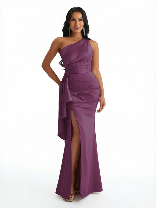 Women Sexy One Shoulder Mermaid Ruffles Soft Satin Long Formal Dresses Side Slit